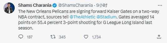 Shams:消息人士透露,新奥尔良鹈鹕队正在以一份双向NBA合同签下前锋凯撒·盖茨。盖茨上赛季在发展联盟长岛队场均得到14分,三分球命中率为55.4%。