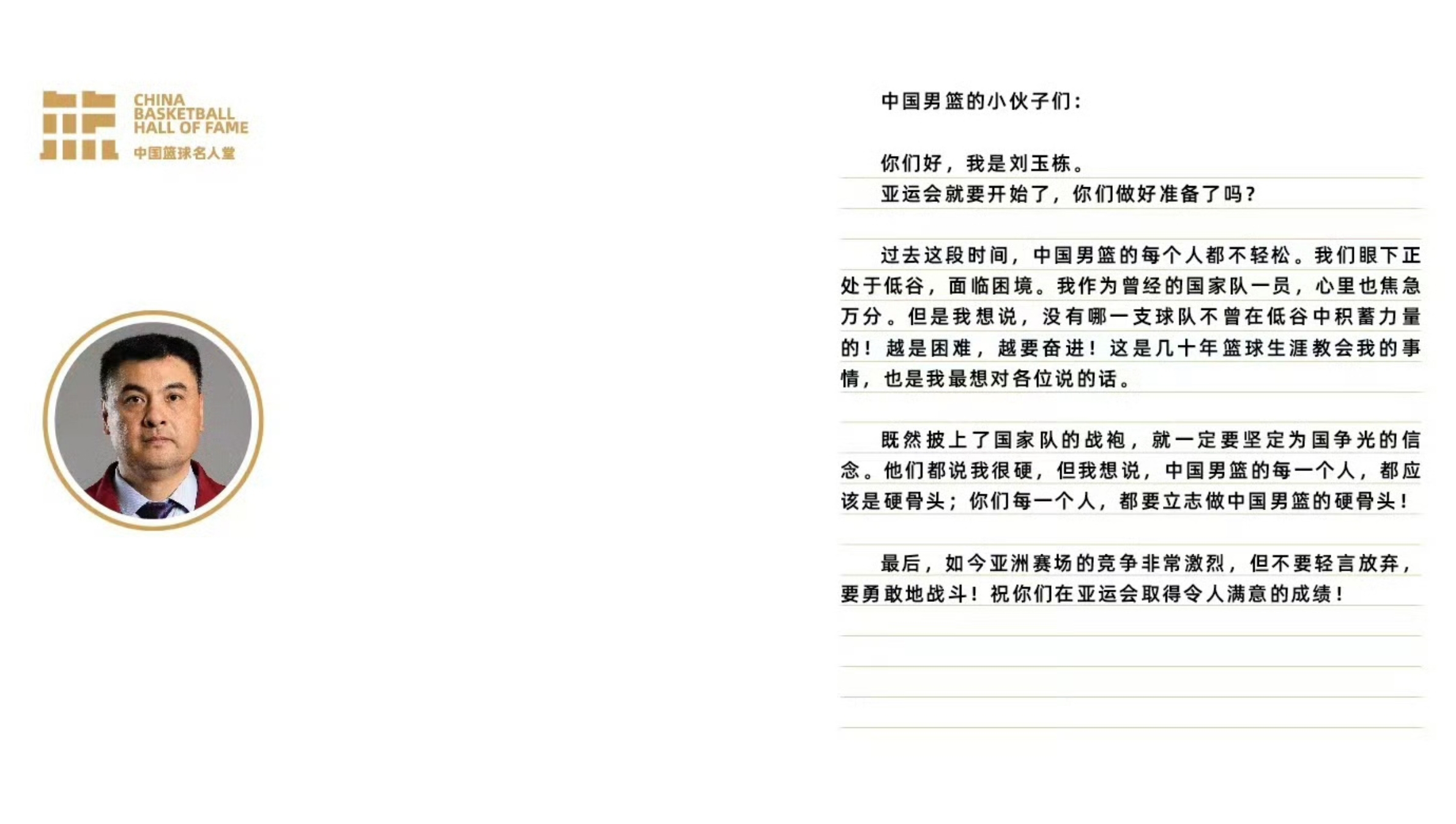 在亚运会开始之前,男篮结束了早上的赛前踩场。而在全部训练结束之后,名人堂成员刘玉栋、胡卫东来信,以此来鼓舞全队的精气神。
