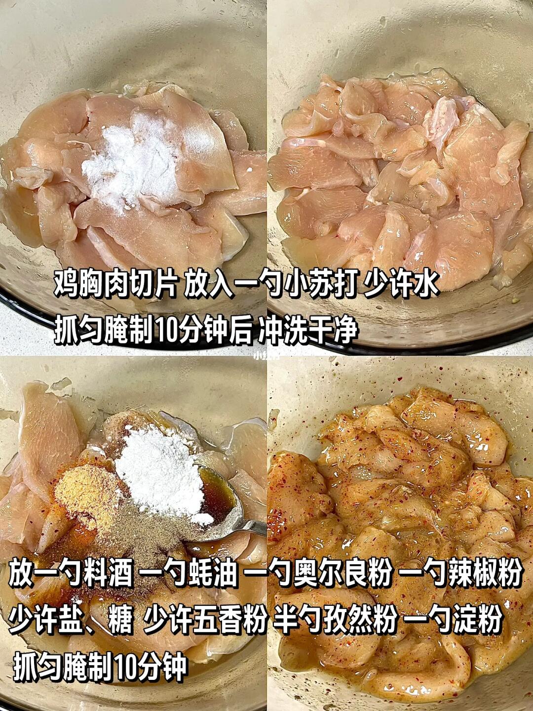 鸡胸肉居然能一点都不柴!吃一口就爱上! 🌟食材: 鸡胸肉 调料:一勺生抽 一勺蚝油 一勺辣椒粉 一勺奥尔良粉 少许盐 糖 鸡精 半勺孜然粉 一勺淀粉