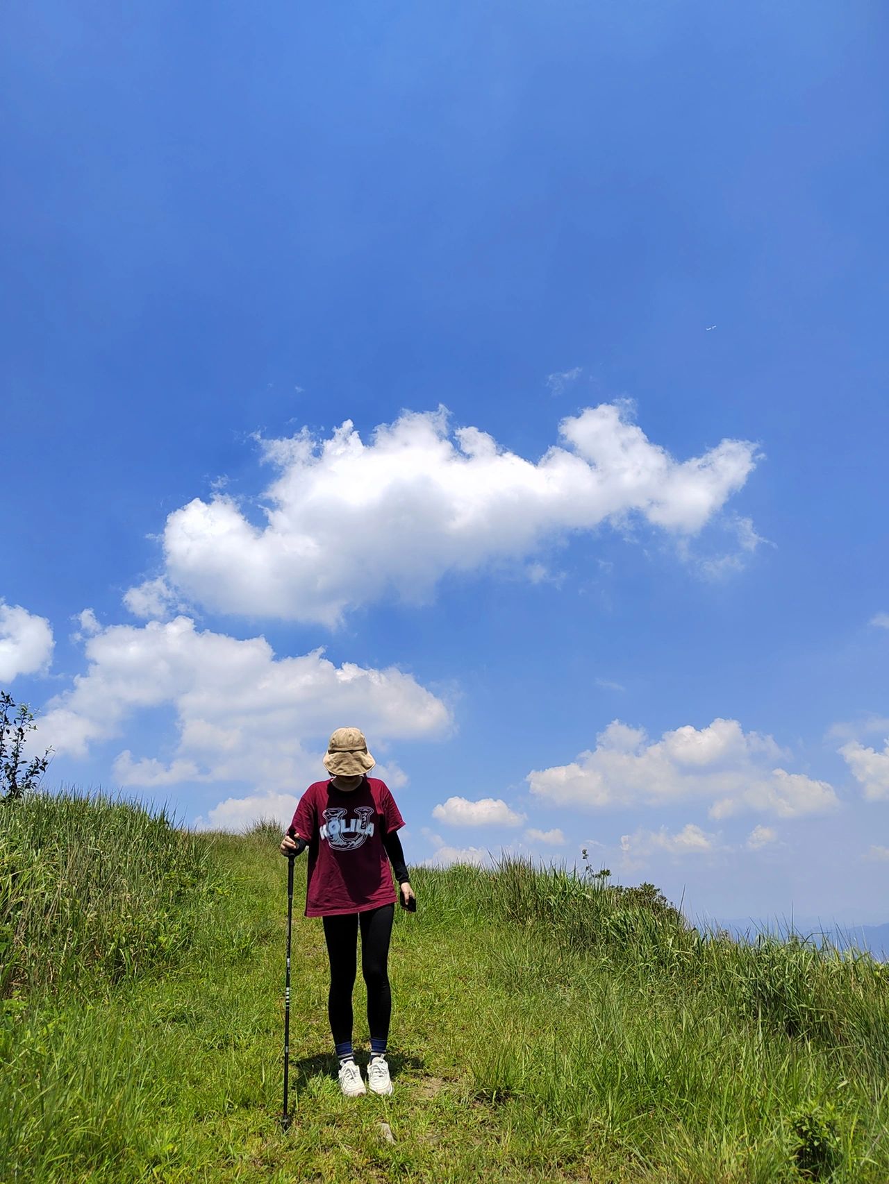 登山杖、水、适量干粮(面包、压缩饼干、水果等)、防晒(帽子、手袖、防晒衣、防晒霜等)