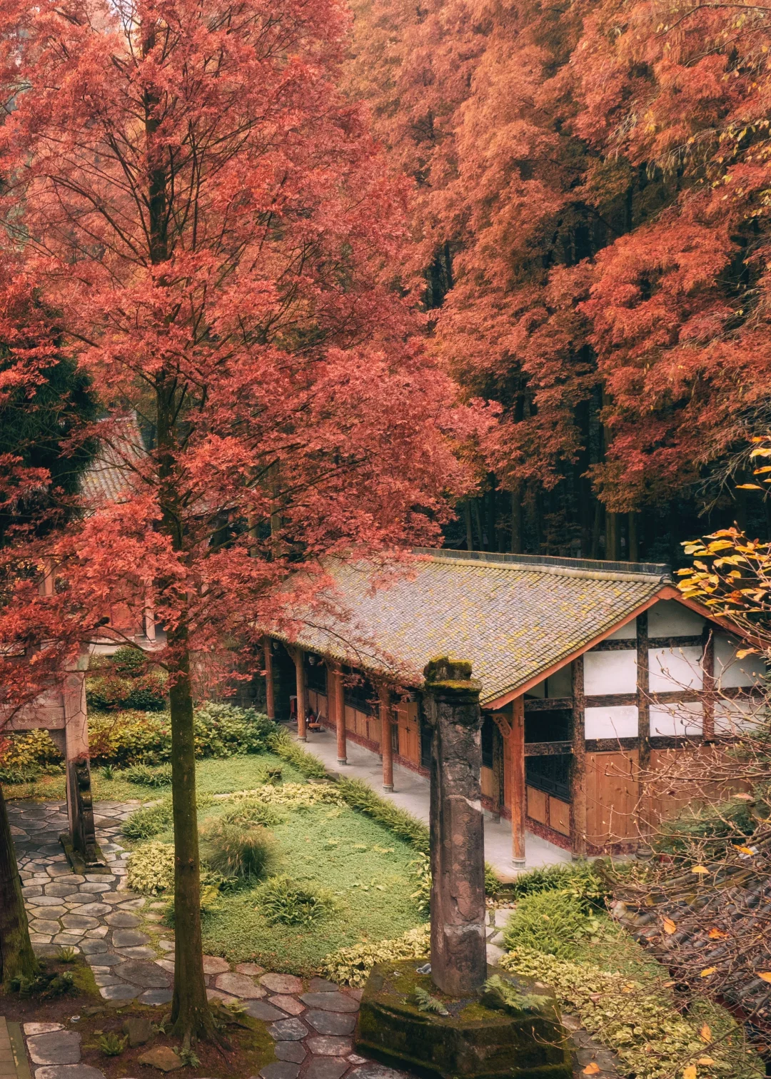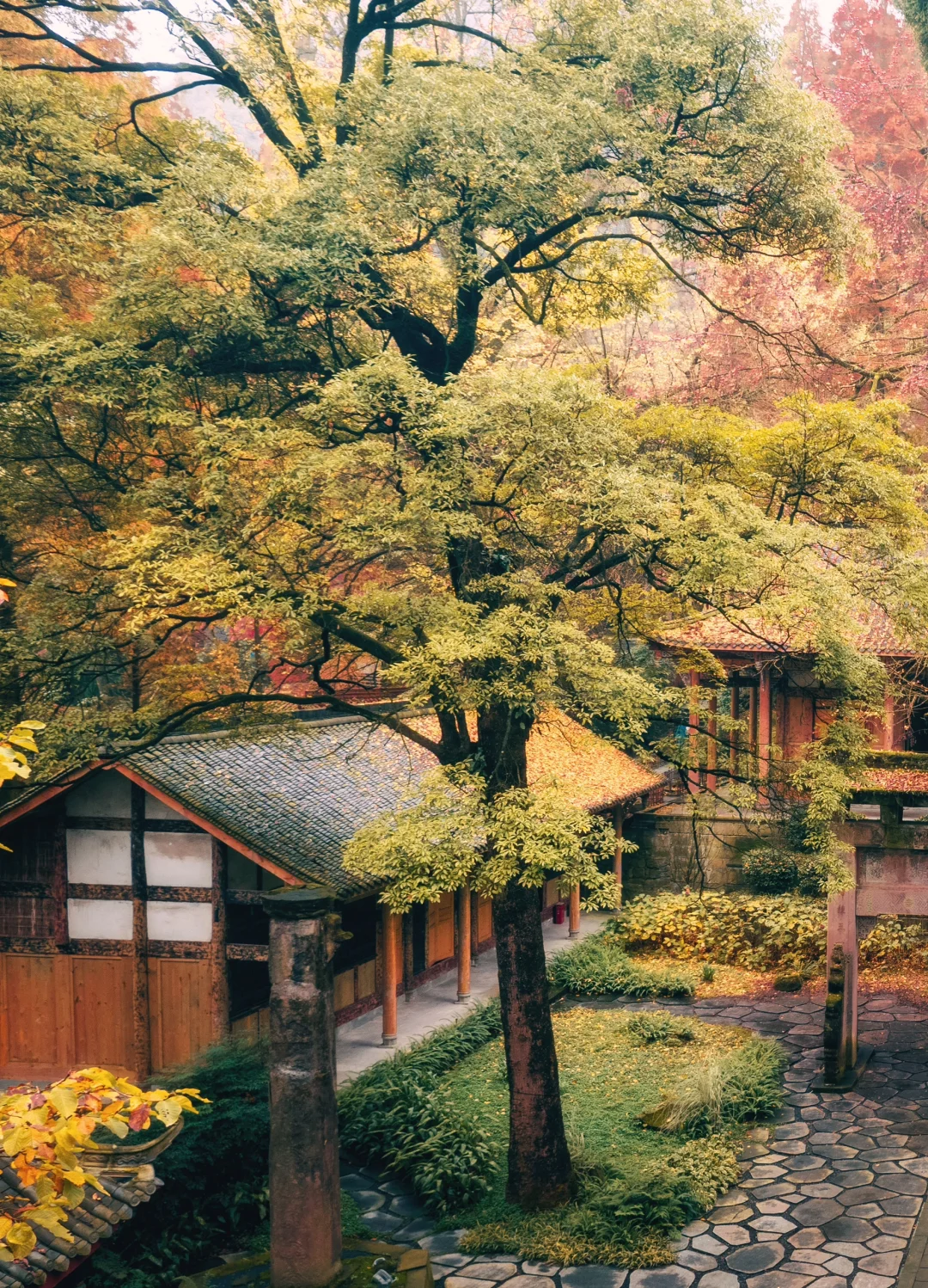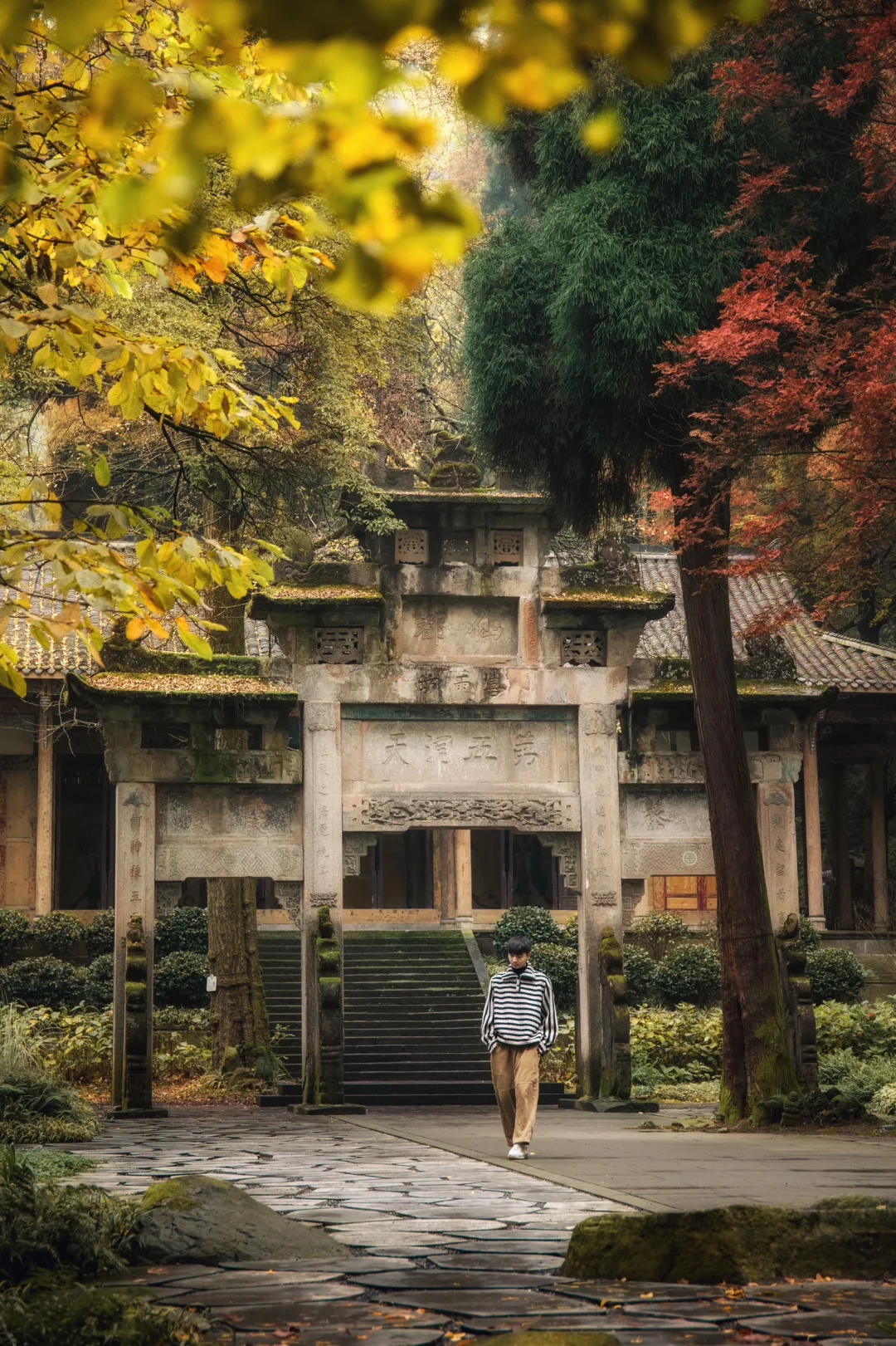 灵岩寺的秋景绝对算是成都一绝了,隐藏在深山里的千年古刹和金黄的银杏古树和红色杉树融为一体,氛围感简直绝了。