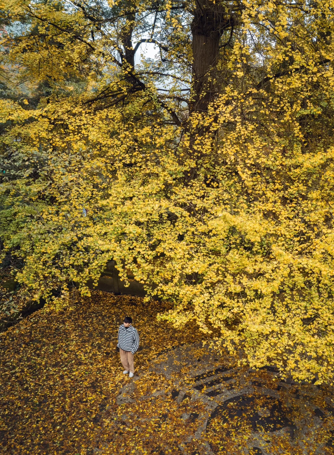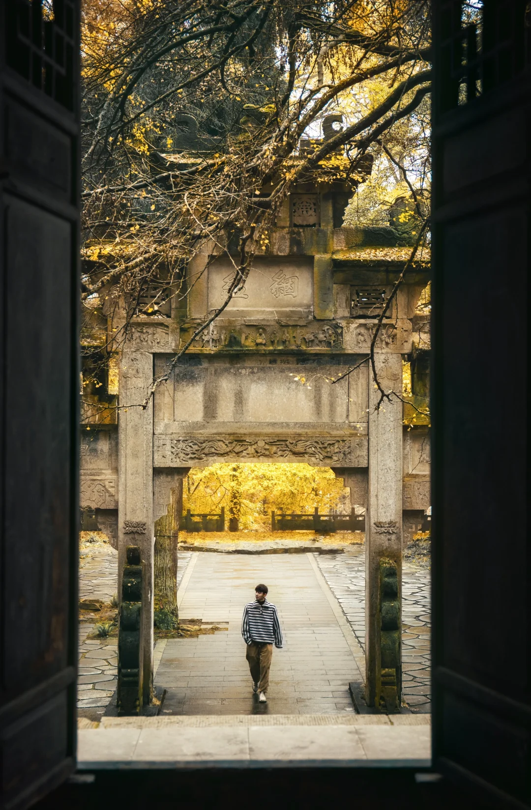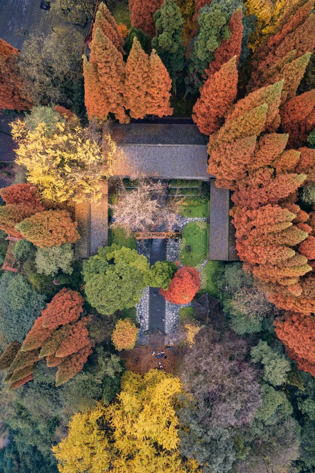 灵岩寺的秋景绝对算是成都一绝了,隐藏在深山里的千年古刹和金黄的银杏古树和红色杉树融为一体,氛围感简直绝了。