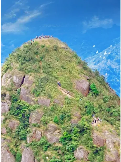 右边是上鸡头顶,上山顶有一段需要借助绳子爬升,需小心通过,到达山顶视野开阔。站在山顶是清晰的看到附近千米高峰。