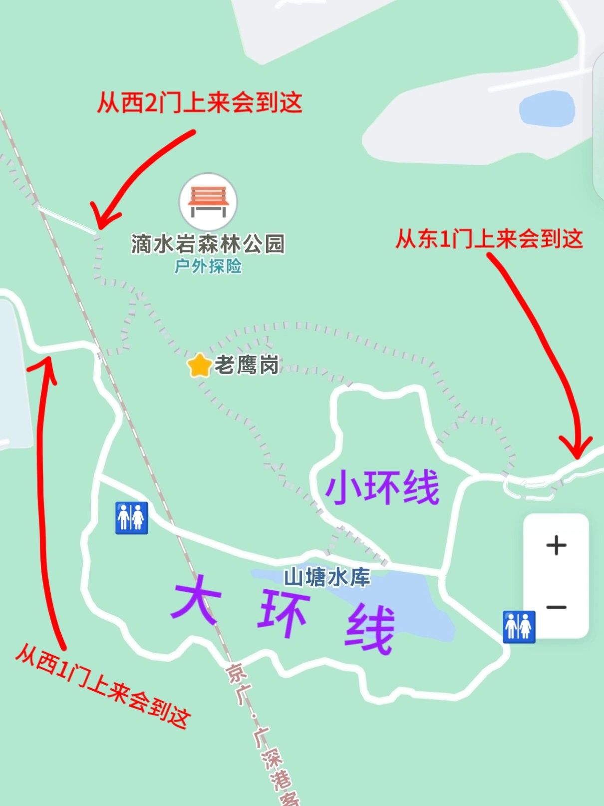 🌏推荐路线1:从东1门进去,走水泥路10分钟到达小环线,沿着大小环线游览。这条路线是最轻松的。
