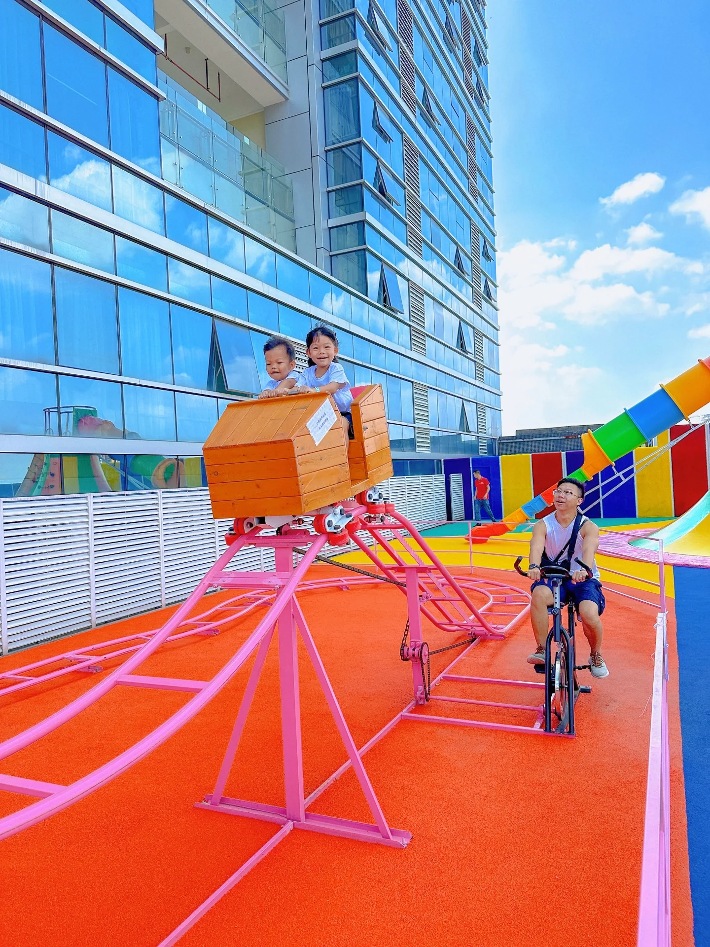 🔘坑爹过山车🎢,爸爸踩单车动力驱动木质过山车,坐在上面的姐弟直呼过瘾