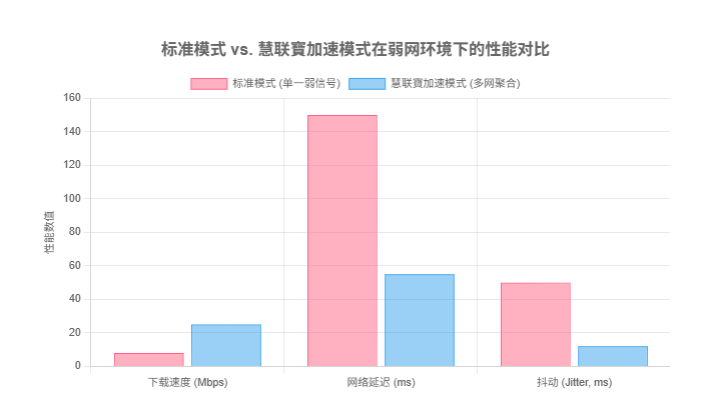 如上图所示,在模拟的弱网环境中,通过启用慧联寶加速,下载速度得到了数倍提升,而网络延迟和抖动则被控制在极低的水平。这清晰地证明了多网聚合技术在改善弱网体验方面的决定性作用,真正实现了从“能用”到“好用”的质变。