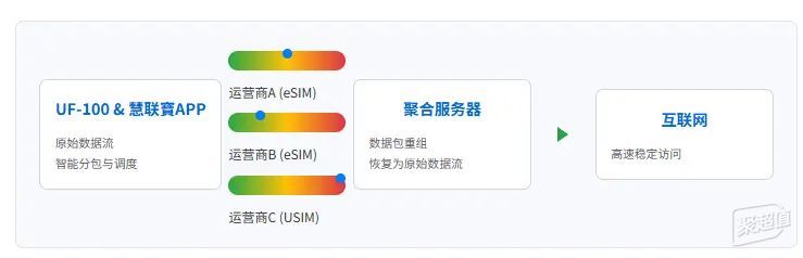 慧联寶APP的多网聚合技术,正是利用了UF-100硬件具备多路网络接口(2个eSIM + 1个USIM)的独特优势,其工作流程可分解为以下几个关键步骤: