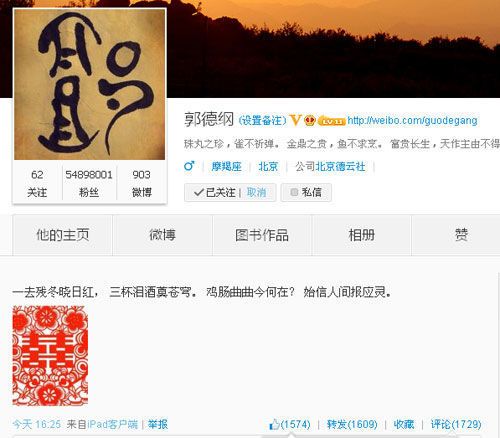 次日,郭德纲在微博发布一首打油诗:“一去残冬晓日红,三杯酒泪奠苍穹。鸡肠曲曲今何在?始信人间报应灵”,并配上大红“囍”字图片,还将该微博置顶。