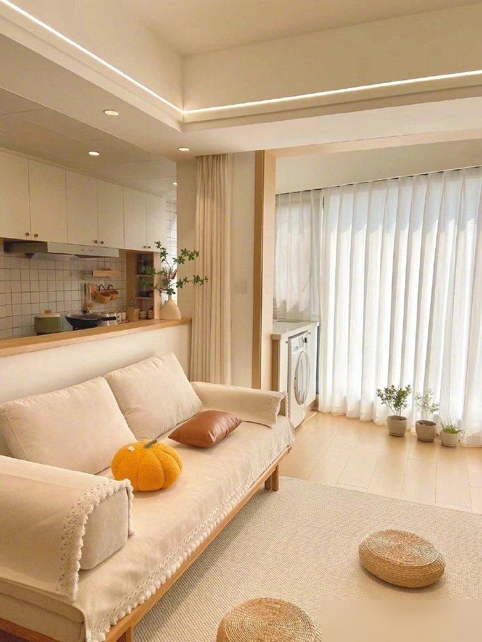客厅看着是真舒服。没摆大茶几,就一张地毯两个蒲团,空间立马就显大了。这种思路值得很多小户型借鉴。东西少了,心就不烦。柔和的色调配上简约的家具,温馨感自然就出来了。过日子要的不就是这份舒坦嘛。