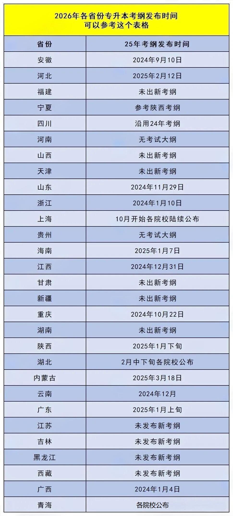 下方整理了2025年各省份专升本考纲的公布时间,2026年专升本的同学可以提前参考。