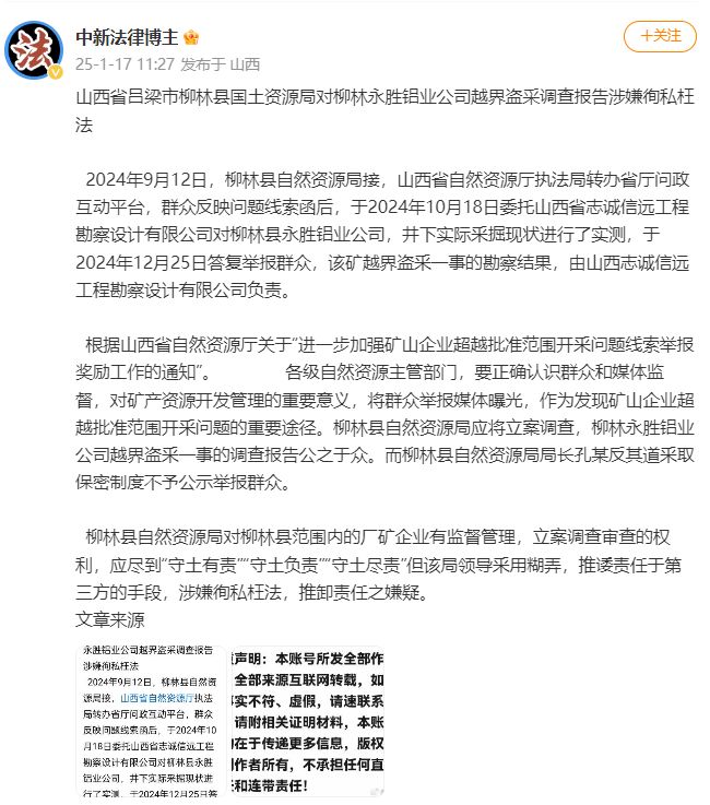 2024 年 9 月 12 日,柳林县自然资源局接到山西省自然资源厅执法局转办的群众反映问题线索函,10 月 18 日委托山西省志诚信远工程勘察设计有限公司,对柳林永胜铝业公司井下实际采掘现状实测,12 月 25 日答复举报群众,称越界盗采勘察结果由该公司负责。