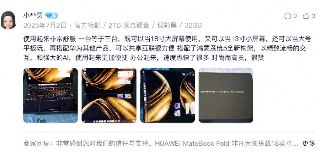 有许多用户就表示,华为MateBook Fold 非凡大师 “搭配华为其他产品,可以共享互联很方便”,华为MateBook Pro“和华为手机联动起来非常丝滑”、“鸿蒙系统带来的跨设备协同体验非常流畅,高效,手机、平板电脑互联无缝衔接”。