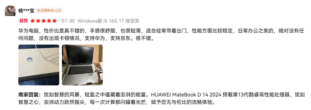 对于预算有限的年轻群体,华为MateBook D 14以高质价比成为学习与轻办公的优选。有用户评价提到,“华为电脑,性价比是真不错的,手感很舒服,也很轻薄,适合经常带着出门,性能方面比较稳定,日常办公之类的,没有任何问题,没有出现卡顿情况”。