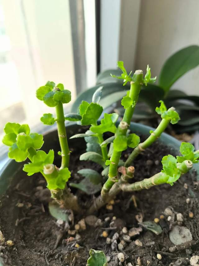 2.不同的地域,温度上升的速度有快有慢,有些长寿花在4月份之后也会断断续续的长出一些新叶,我们要适当的修短一些,刺激侧枝的生长。