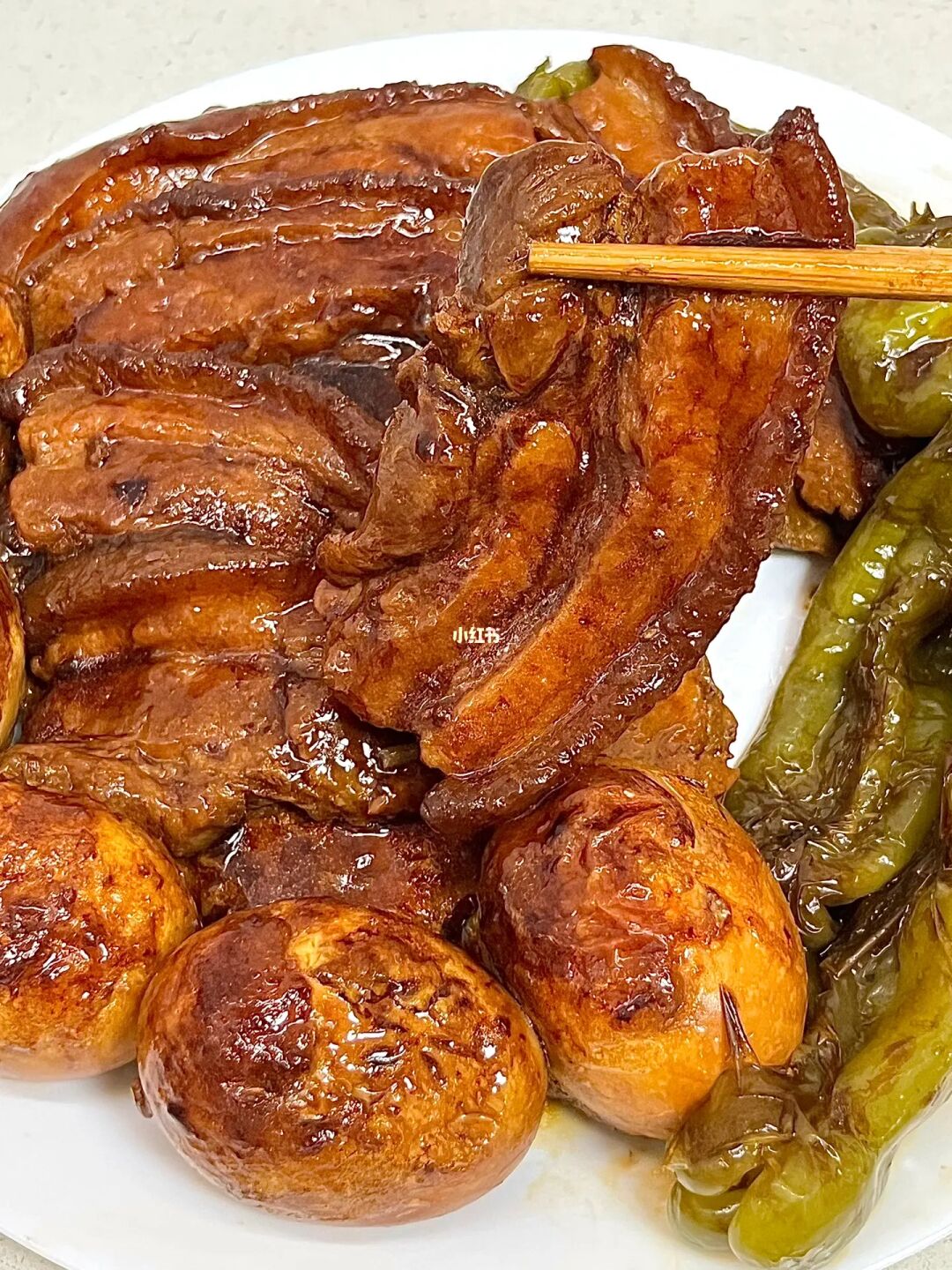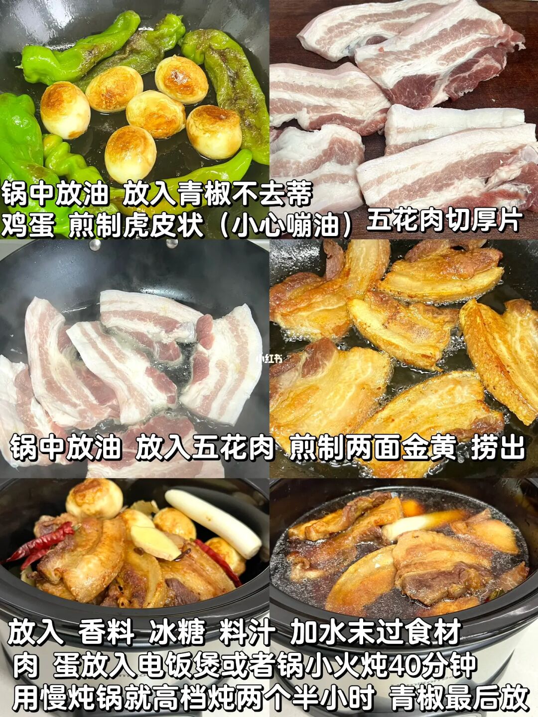 2⃣️五花肉切厚片,锅中放油煎制两面金黄,把肉和鸡蛋放入🌟电饭煲(或者锅)小火炖煮40分钟,最后放入青椒再炖10分钟✅