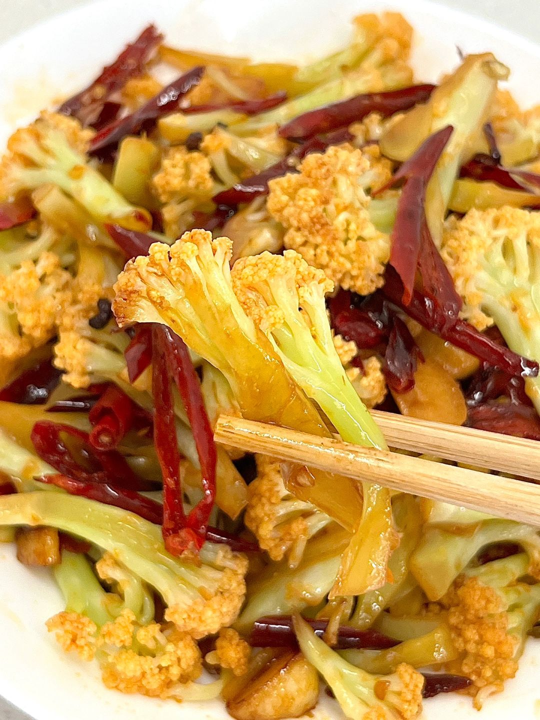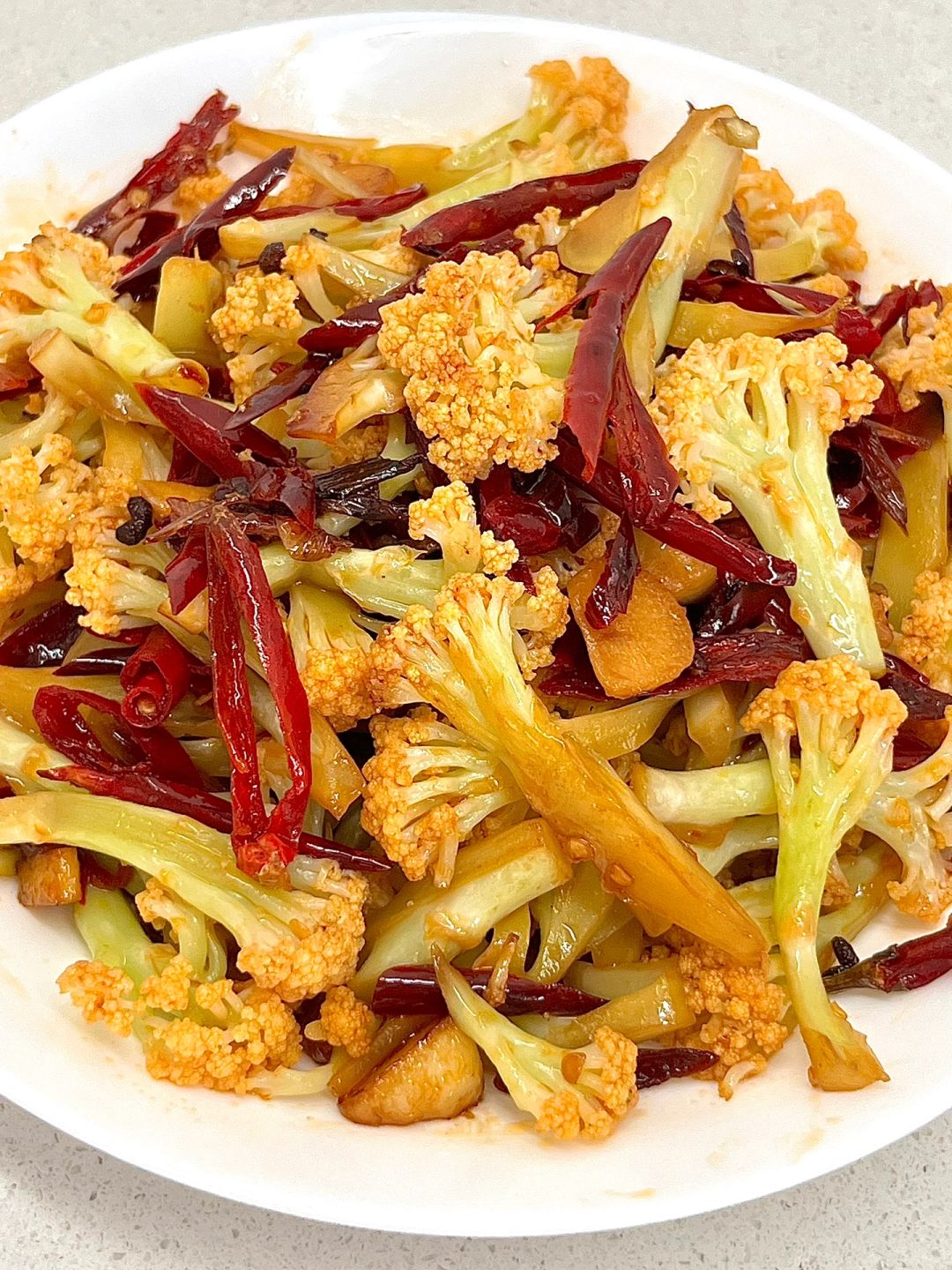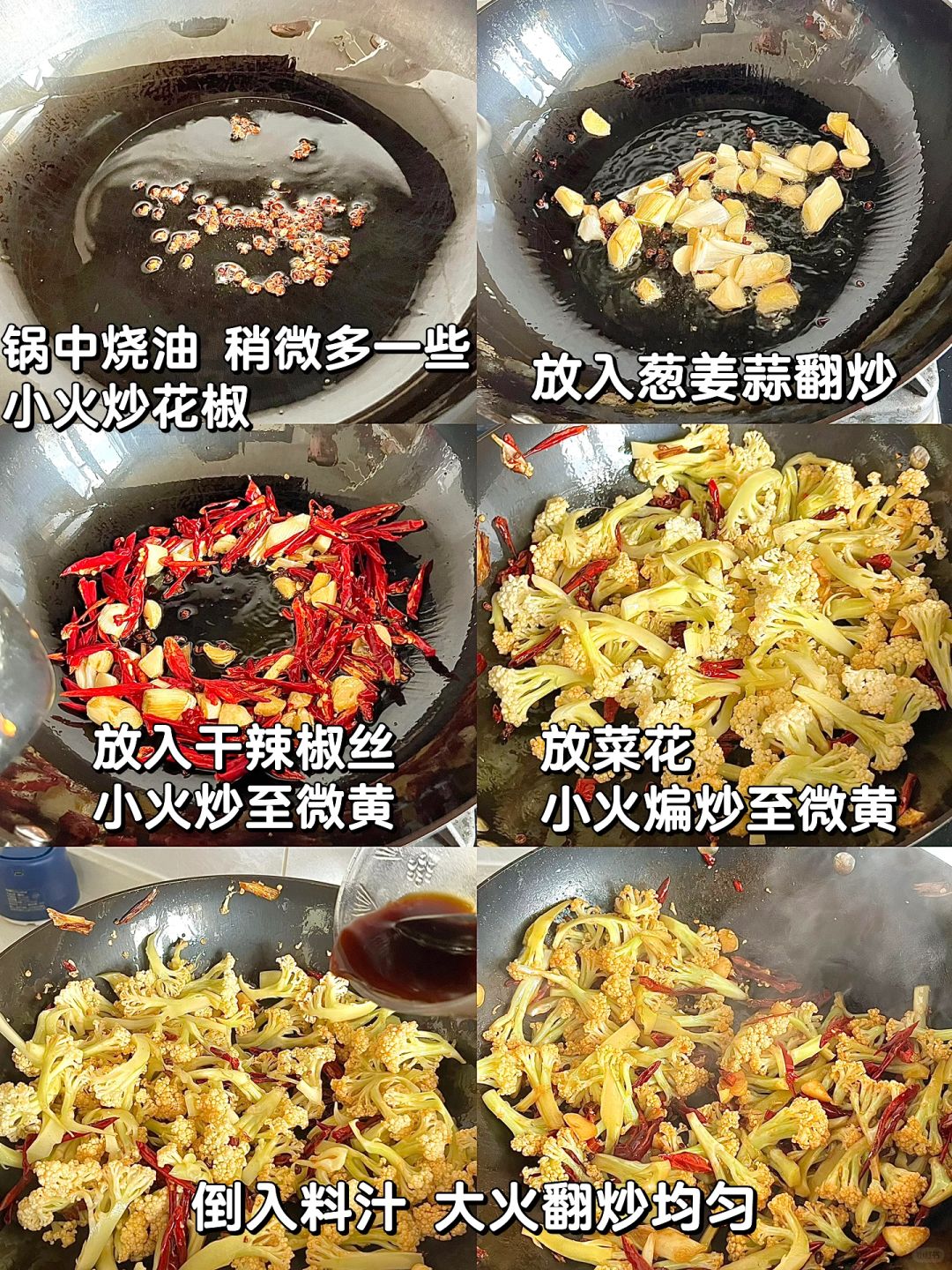 🌟食材: 菜花、干辣椒丝、花椒、葱姜蒜 🌟步骤: 1⃣️调料汁:两勺生抽、一勺蚝油、一勺白糖、一勺醋、少许盐、少许鸡精、少许清水搅拌均匀 2⃣️锅中烧油,稍微多些,小火放花椒炒香,再放入葱姜蒜炒香,再放干辣椒丝,小火炒至微微发黄 3⃣️倒入菜花,小火煸炒至微微发黄,然后倒入料汁,大火翻炒一下✅