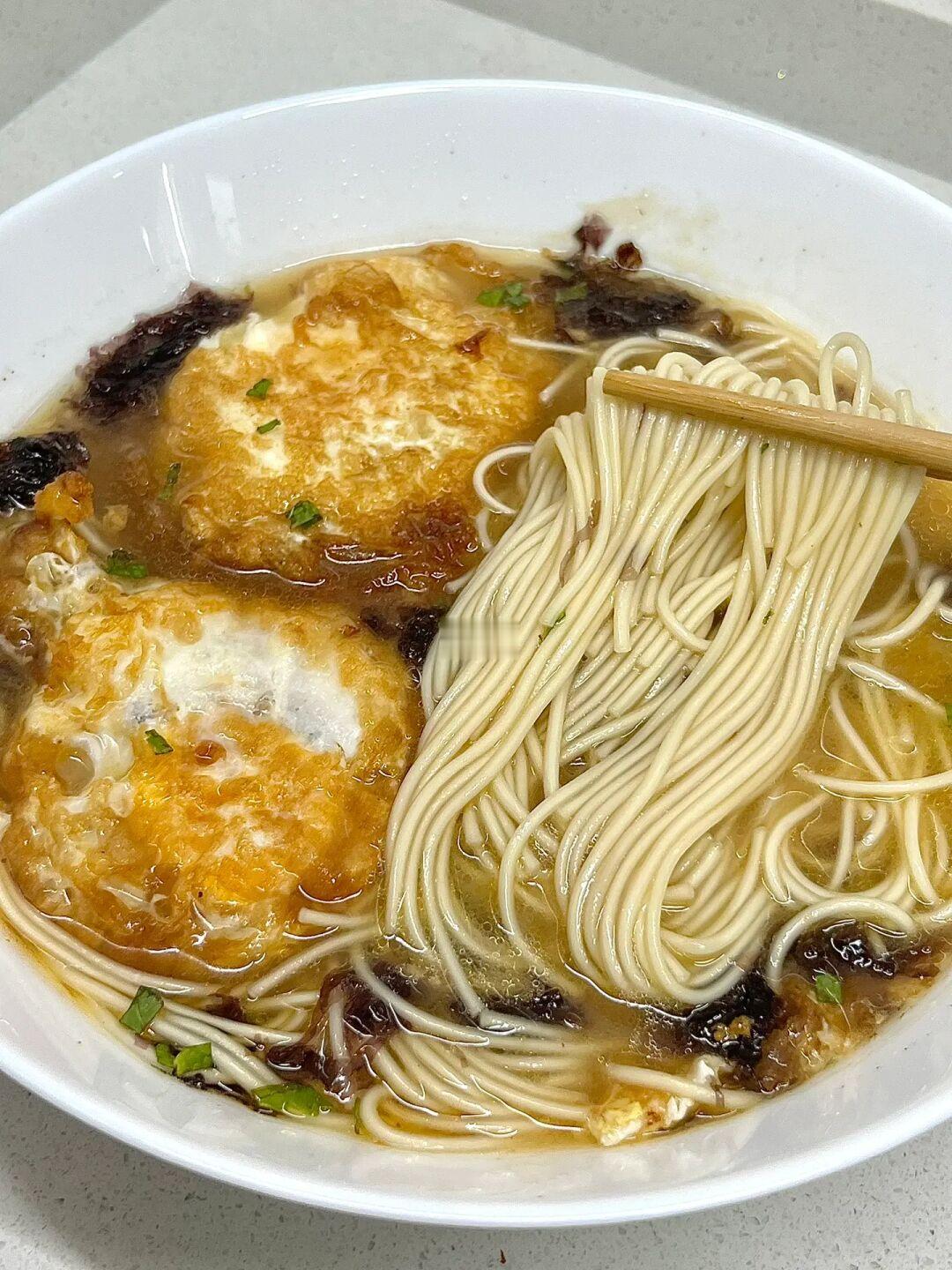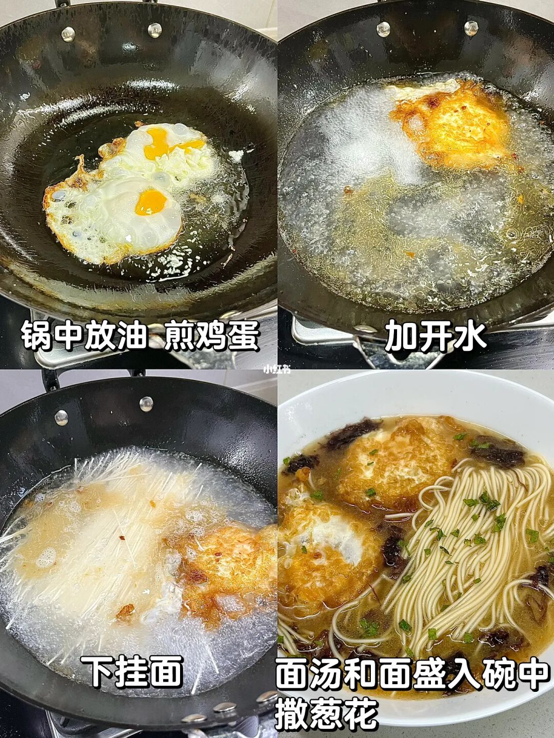 快手面人人都要会! 🌟食材: 鸡蛋、挂面、小葱 🌟步骤: 1⃣️准备一个小碗:两勺生抽、一勺醋、一勺香油、少许盐、鸡精、白糖、胡椒粉,撒紫菜备用 2⃣️锅中烧油煎鸡蛋,倒入开水(这样汤才会白),下挂面,往调料碗中加面汤,盛出面条,撒葱花✅