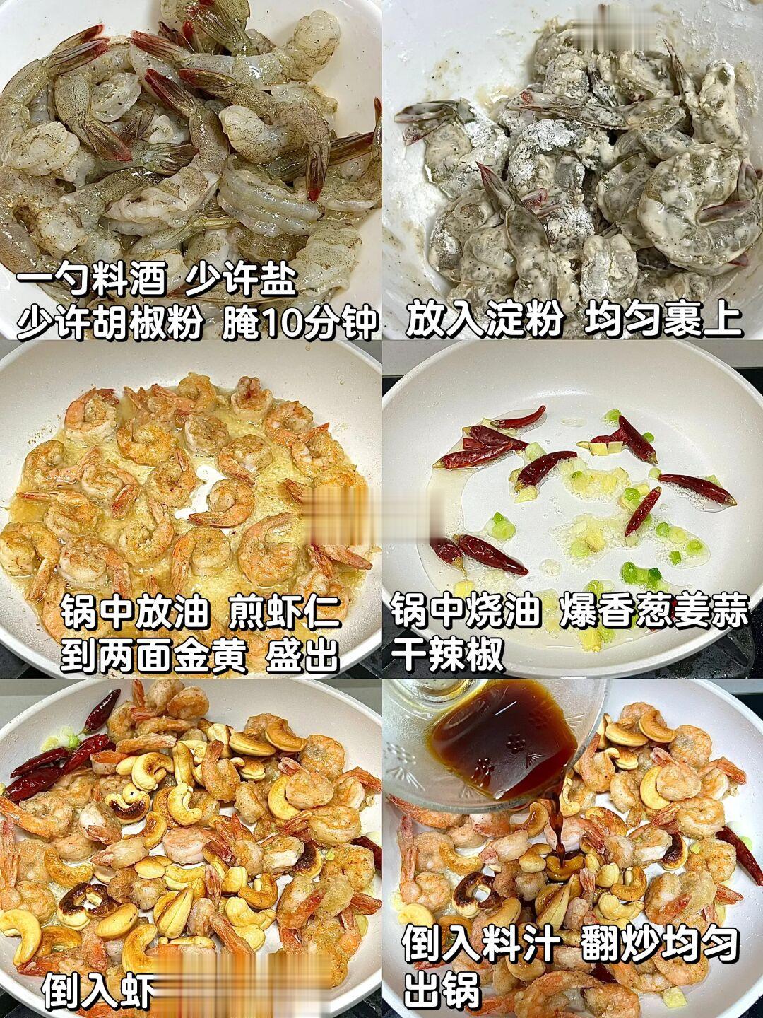 4⃣️另起锅放油,爆香葱姜蒜、干辣椒,放入虾仁和腰果,倒入料汁翻炒均匀,出锅✅