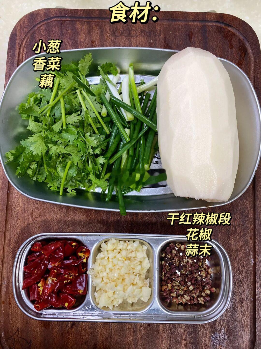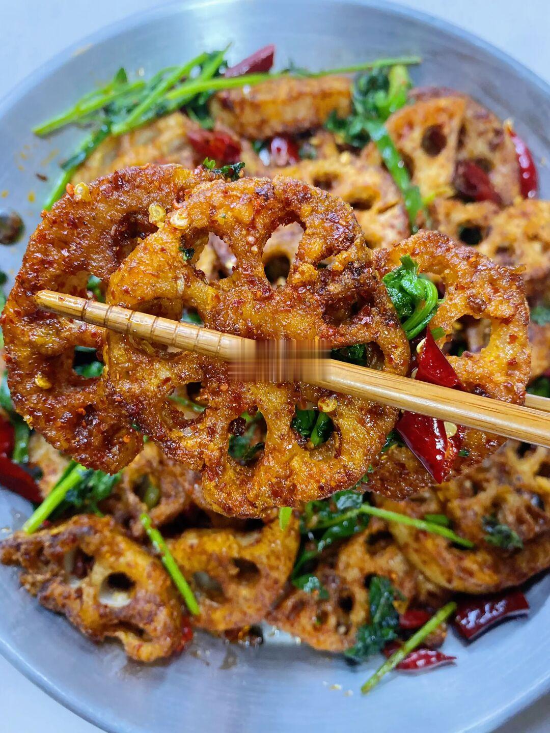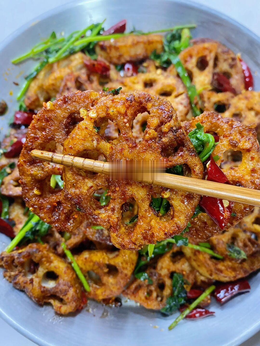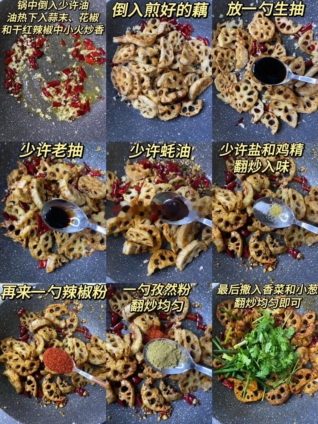 🍃食材: 藕、葱、香菜、干红辣椒、花椒、大蒜 🍃做法: 1、葱、香菜、干红辣椒切小段、大蒜切末。 2、藕切成厚片,然后从中间切开,放入淀粉,让莲藕都裹上淀粉。 3、锅中倒入适量油,油热放入莲藕煎至两面焦黄盛出备用。 4、锅中倒入适量油,油热下入蒜末、花椒和干红辣椒中小火炒香,倒入煎好的藕,放一勺生抽➕少许老抽➕少许蚝油➕少许盐和鸡精翻炒入味,再加一勺辣椒粉➕一勺孜然粉翻炒均匀,最后撒入香菜和小葱翻炒均匀即可。