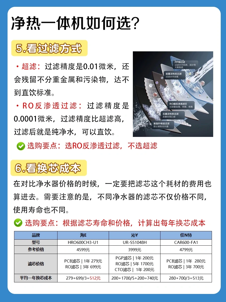 不要只看净水器价格,还根据滤芯寿命和价格,计算出每年换芯成本。