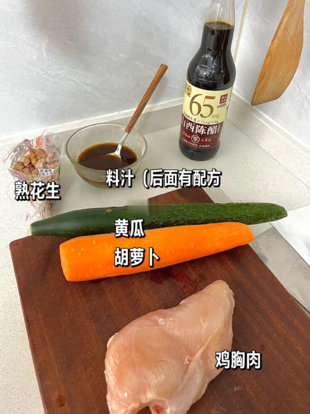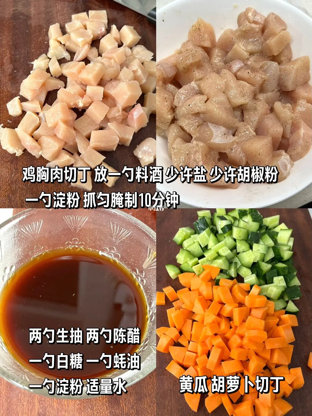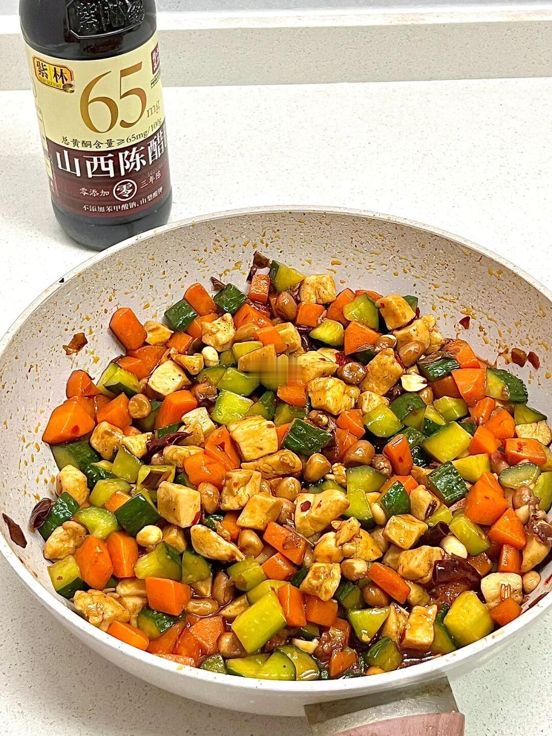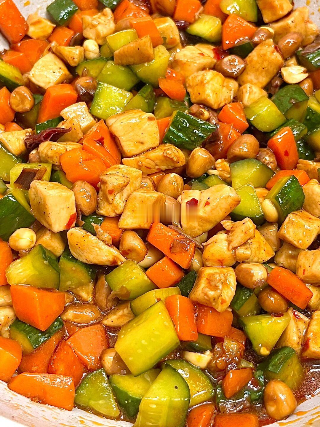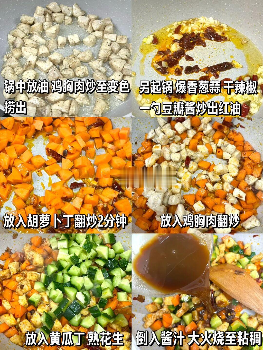 有了这个料汁,天天都想吃宫保鸡丁! - 🌟🌟食材: 鸡胸肉、黄瓜、胡萝卜、熟花生 🌟🌟步骤: 1⃣️鸡胸肉切丁,放一勺料酒、少许盐、少许胡椒粉、一勺淀粉抓拌均匀,腌制十分钟 2⃣️调料汁㊙️:两勺生抽、两勺陈醋、一勺蚝油、一勺白糖、一勺淀粉、适量水 3⃣️锅中烧油,下鸡胸肉炒至变色捞出,另起锅放入葱蒜、干辣椒翻炒,加一勺豆瓣酱炒出红油 4⃣️放入胡萝卜翻炒两分钟,放入鸡胸肉翻炒,放入黄瓜丁、熟花生,最后倒入调料汁,大火收汁至粘稠✅ - 超级好吃!超级快手的宫保鸡丁做好啦!!吃一次就爱上!