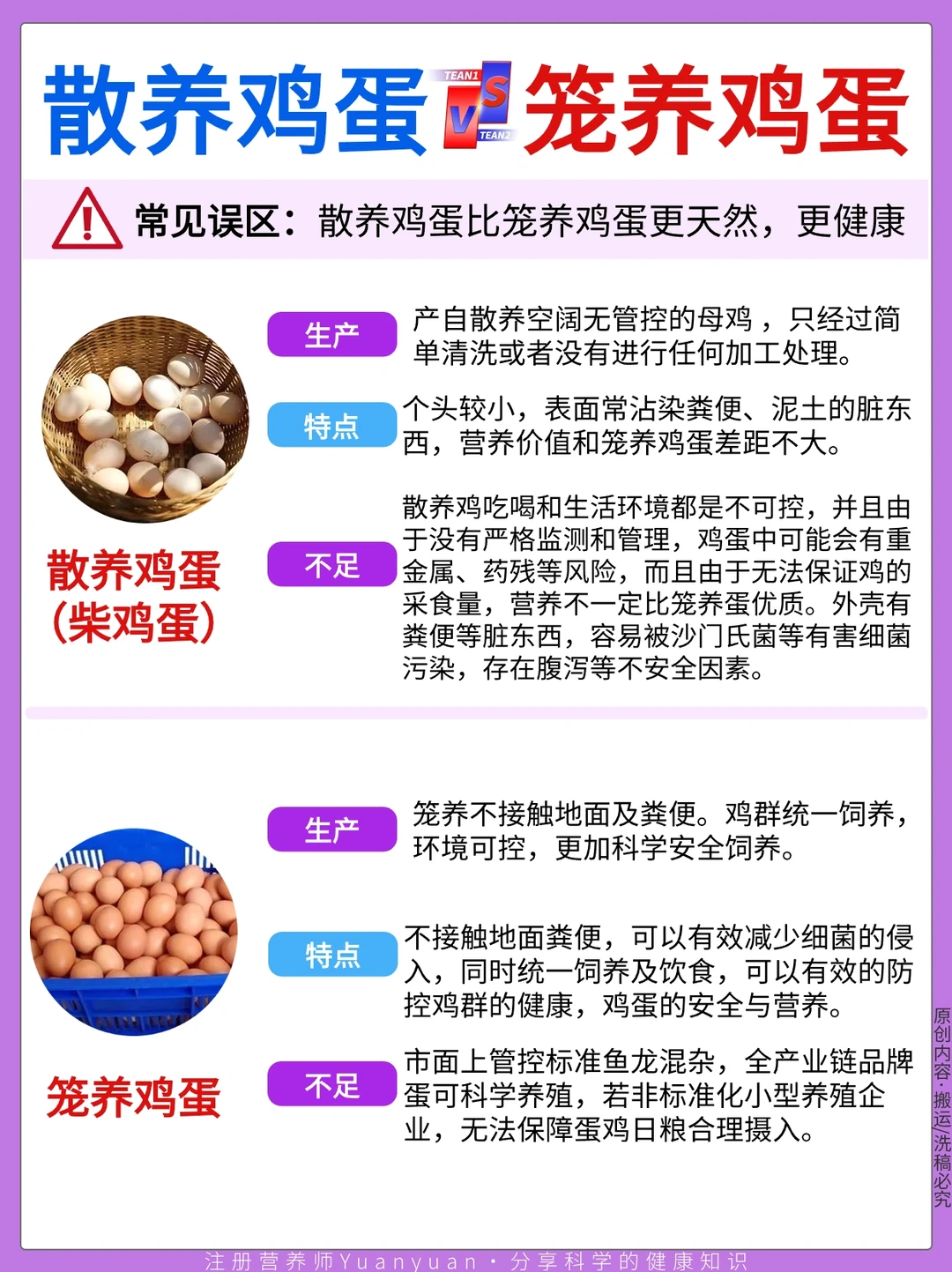 ✅很多消费者存在误区是散养的鸡蛋的营养更好,但实际的情况是,散养鸡吃喝和生活环境都是不可控,并且由于没有严格监测和管理,鸡蛋中可能会有重金属、药残等风险,而且由于无法保证鸡的采食量,营养不一定比笼养蛋优质。