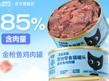 3.迪尤克猫罐头经济实惠的猫罐头测评:迪尤克的定位是“健康型宠物食品普及者”,它倡导以科技与智慧保障宠物营养健康,形成经典系列、递乐系列、无谷鲜肉系列等6大产品线,覆盖猫粮、猫罐头、处方粮、猫砂等多品类。这款e族零食罐头只有金枪鱼味,由金枪鱼、水、鲜鸡肉打底,添加了牛磺酸、果寡糖、甘露寡糖、卵磷脂和3种维生素。包装清新活泼、搭配卡通黑猫形象(品牌IP)引起消费者注意;金属罐搭配易拉环,兼顾便利性与保鲜需求。