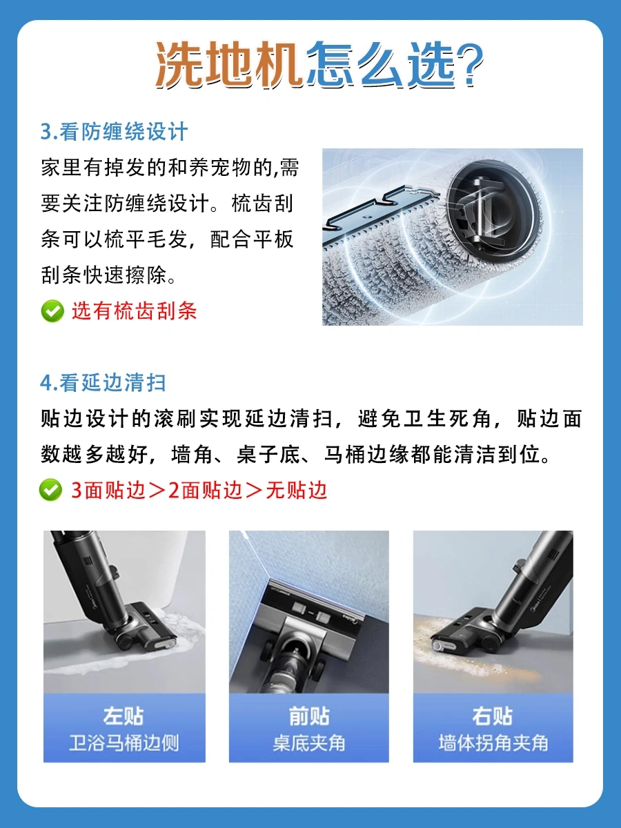 家里有掉发的和养宠物的,需要关注防缠绕设计。优先选择双刮条的洗地机,平直+梳齿刮条 可以更有效的防止滚刷缠绕,双刮条>单梳齿刮条>单平直刮条