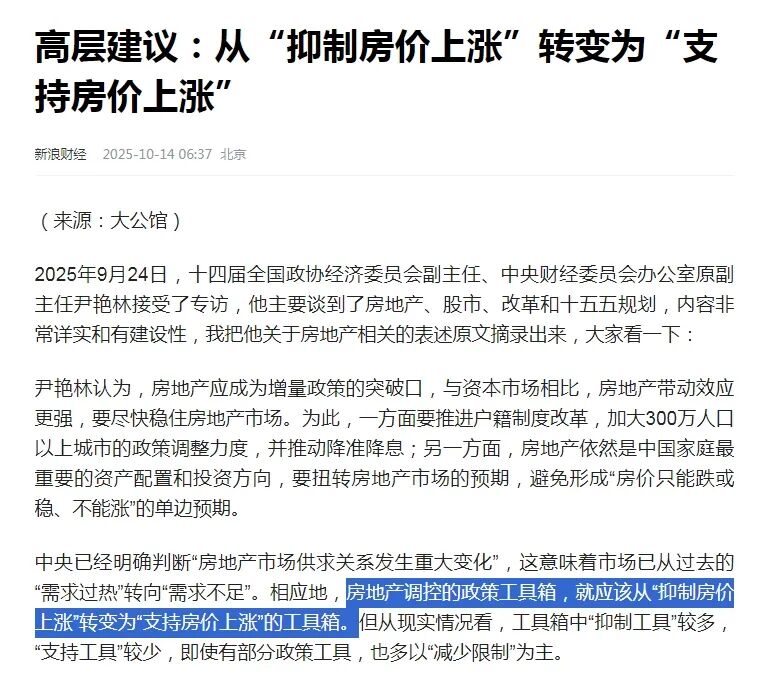 高层罕见表态:房地产调控应从“抑制房价上涨”,转向“支持房价上涨”!