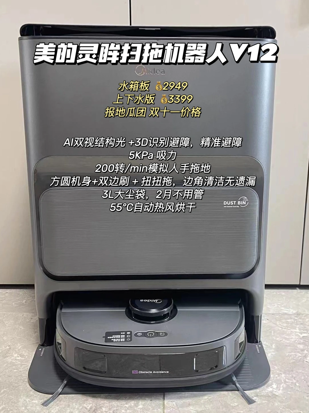 😎目前我自己是确定了趁着双十一入手一台扫地机器人。对比了很久,准备冲这台美的灵眸扫拖机器人V12,主要被它的✅避障(宣传“AI双视结构光,3D识别避障”)和✅扭屁股(看视频遇到墙边能扭着拖)吸引住了‼️对比看了下,凑下来,不到三千的价格,👍🏻扫拖、避障、边角清洁、自清洁都还比较ok,有用过的朋友欢迎分享一下真实使用体验~