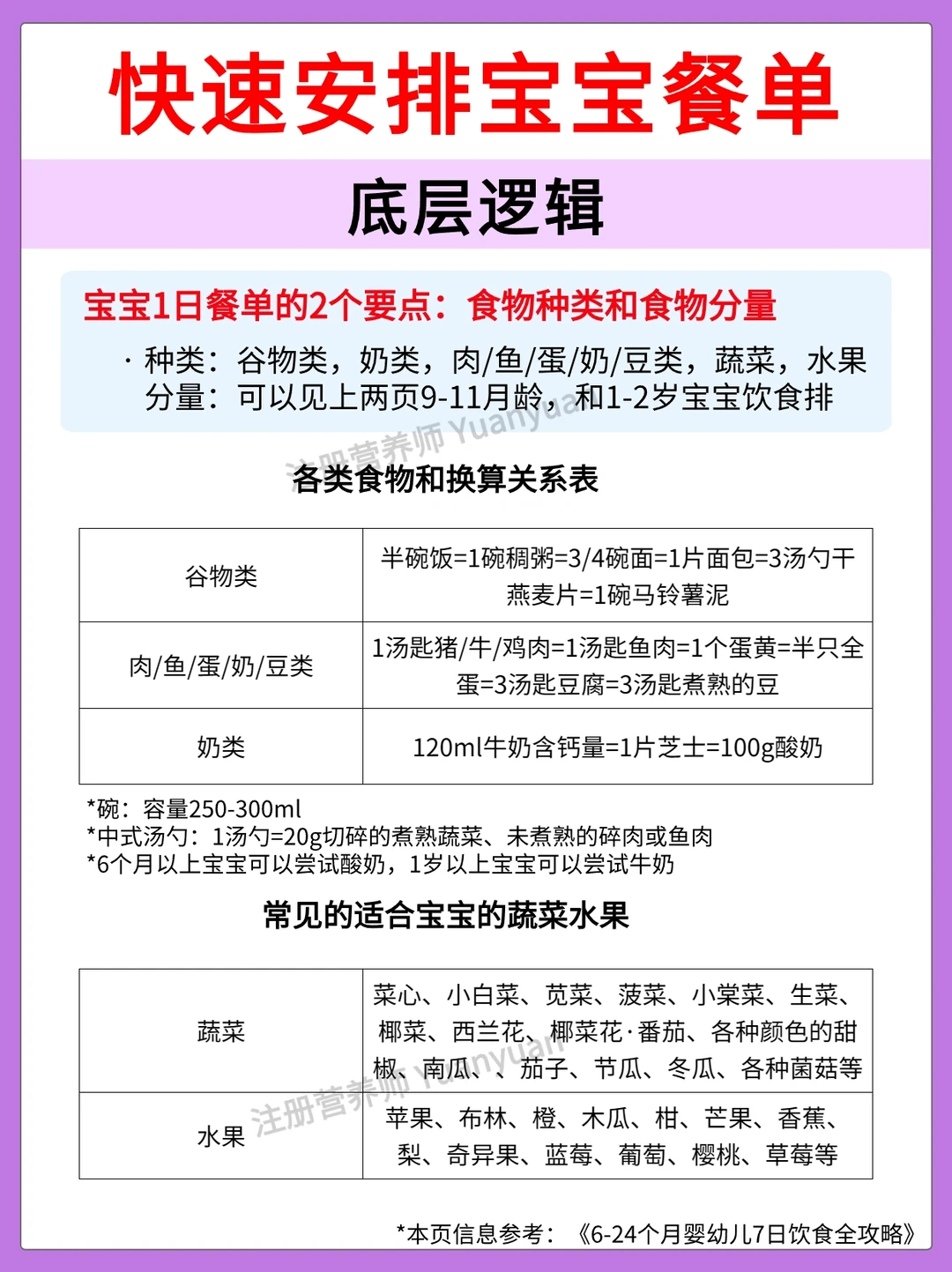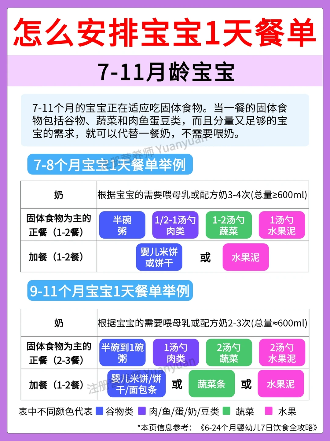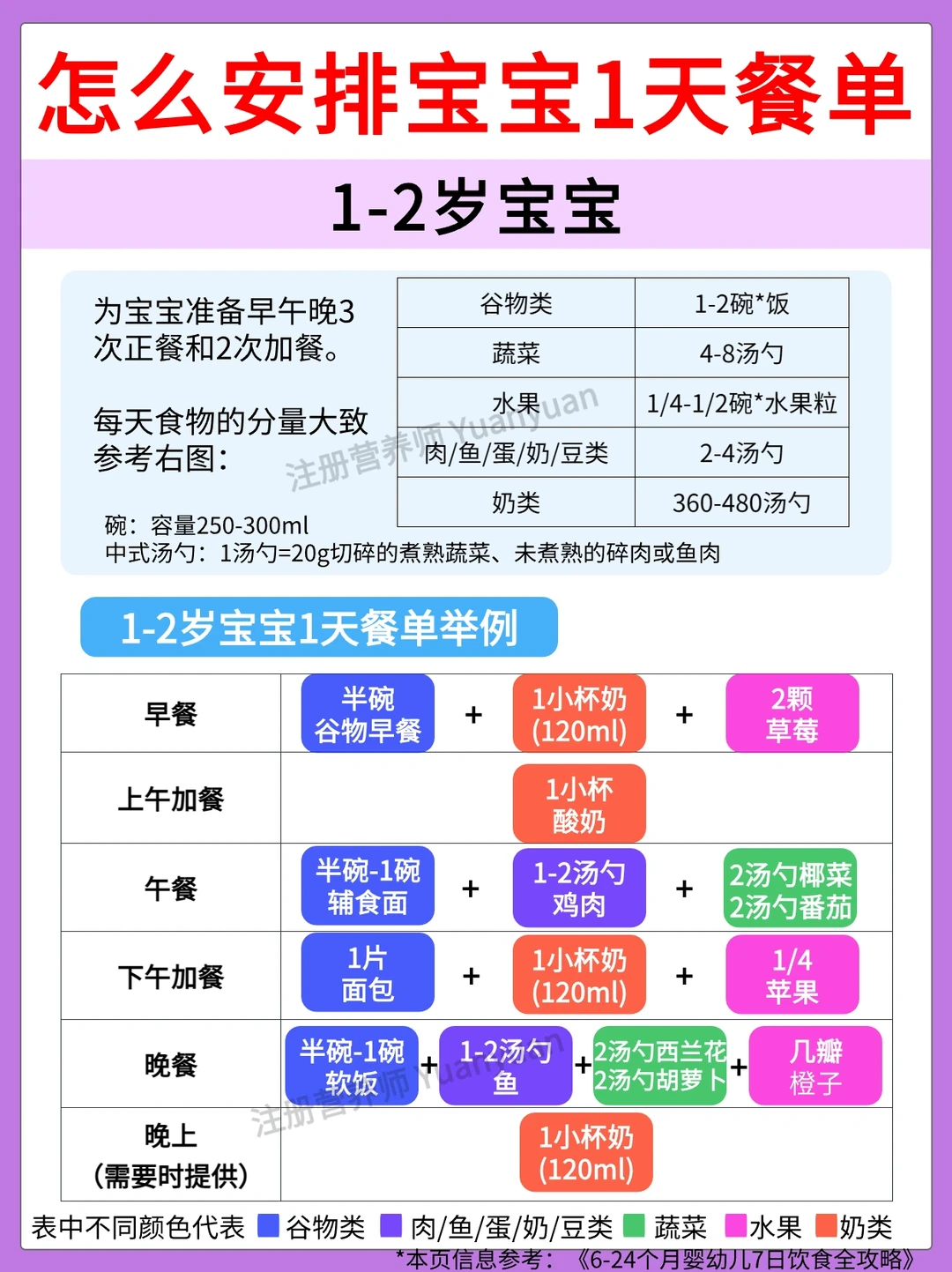 ✅辅食添加量:参考香港卫生署的《6-24个月婴幼儿7日饮食全攻略》给大家准备了7-9月龄,10-11月龄,1-2岁宝宝的1日用餐量,详见图4-5。