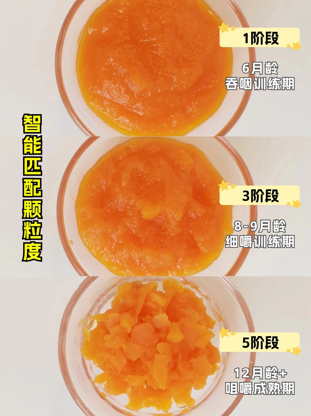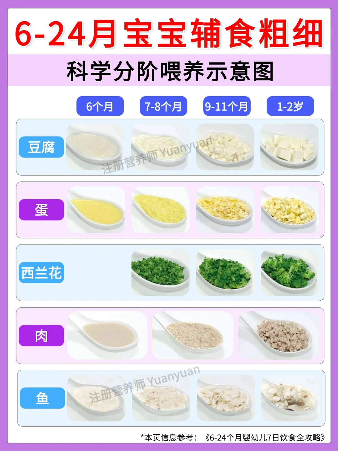 ✅辅食质地:由细到粗、由稀到稠,要根据宝宝月龄分阶段准备食材,不同月龄宝宝适合的食材质地详见图1-2