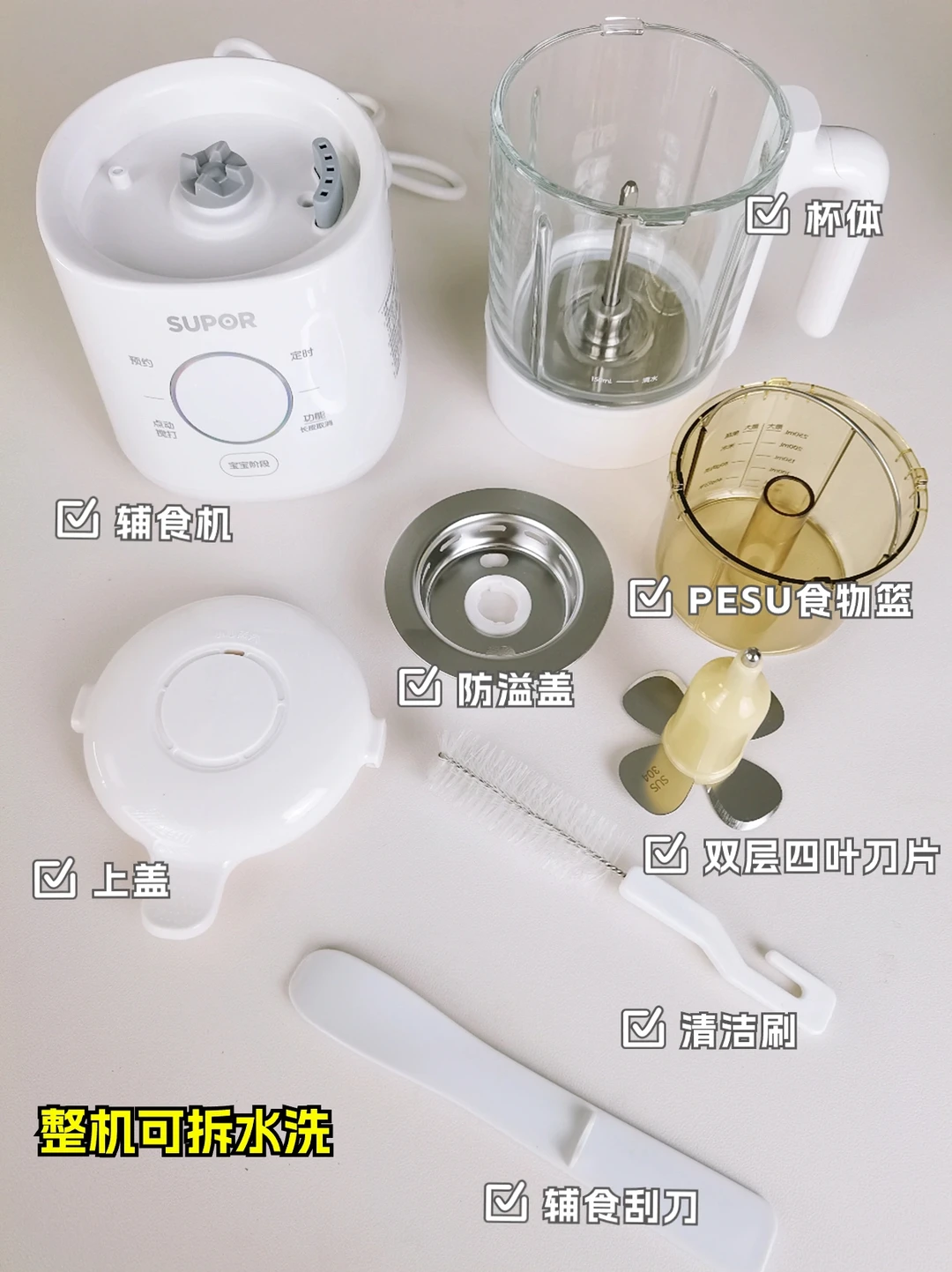 用完后清洗也非常方便,上盖,刀轴,杯体等都能够轻松拆开洗。接触食材的材质都是母婴用食品级材质,给宝宝做辅食也很安心。