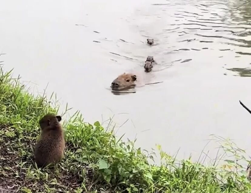 一只卡皮巴拉带着它四个孩子出门游玩,估计今天是游泳训练课,其中一只在岸边没有下水,卡皮巴拉妈妈就带着三只要游走了,一位好心的路人,疯狂的叫卡皮巴拉说:这里还有一只,你有一只忘记带走了。