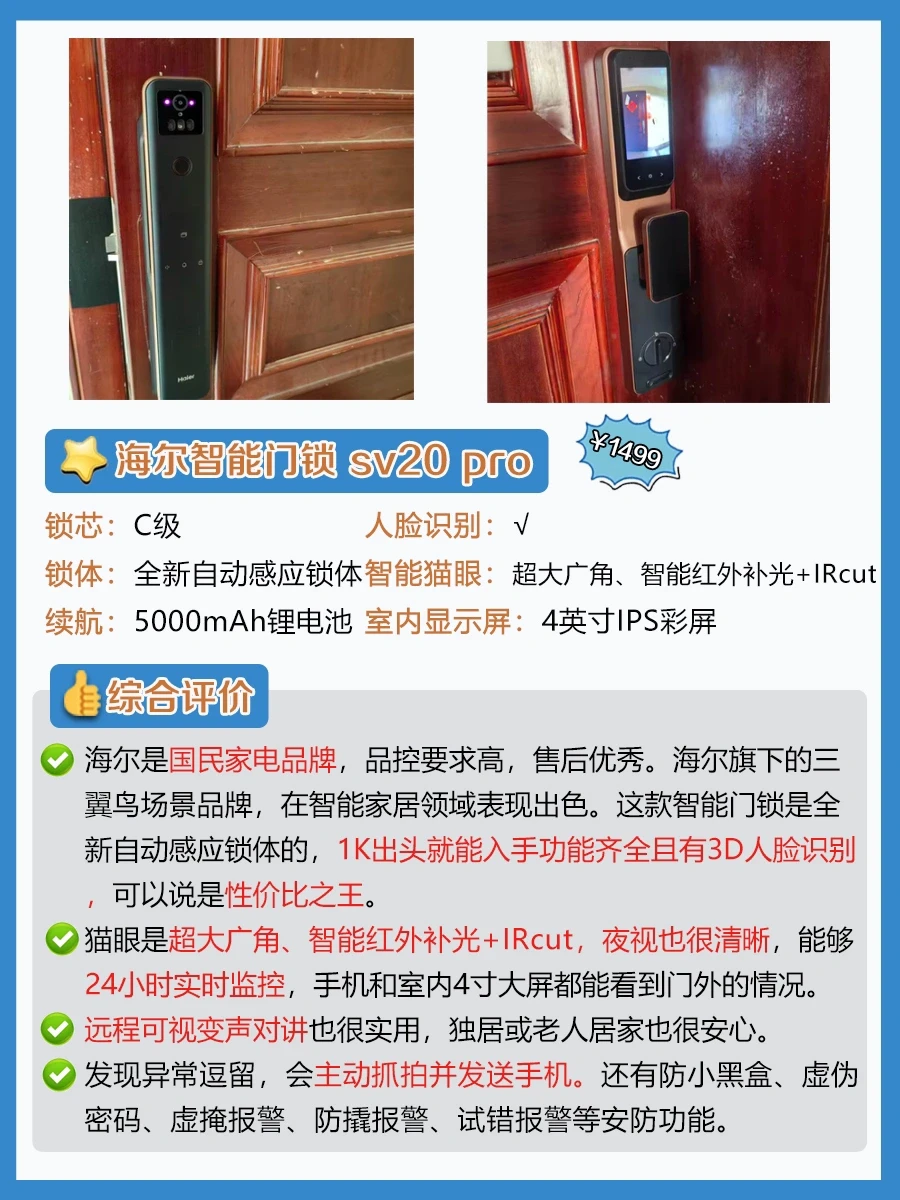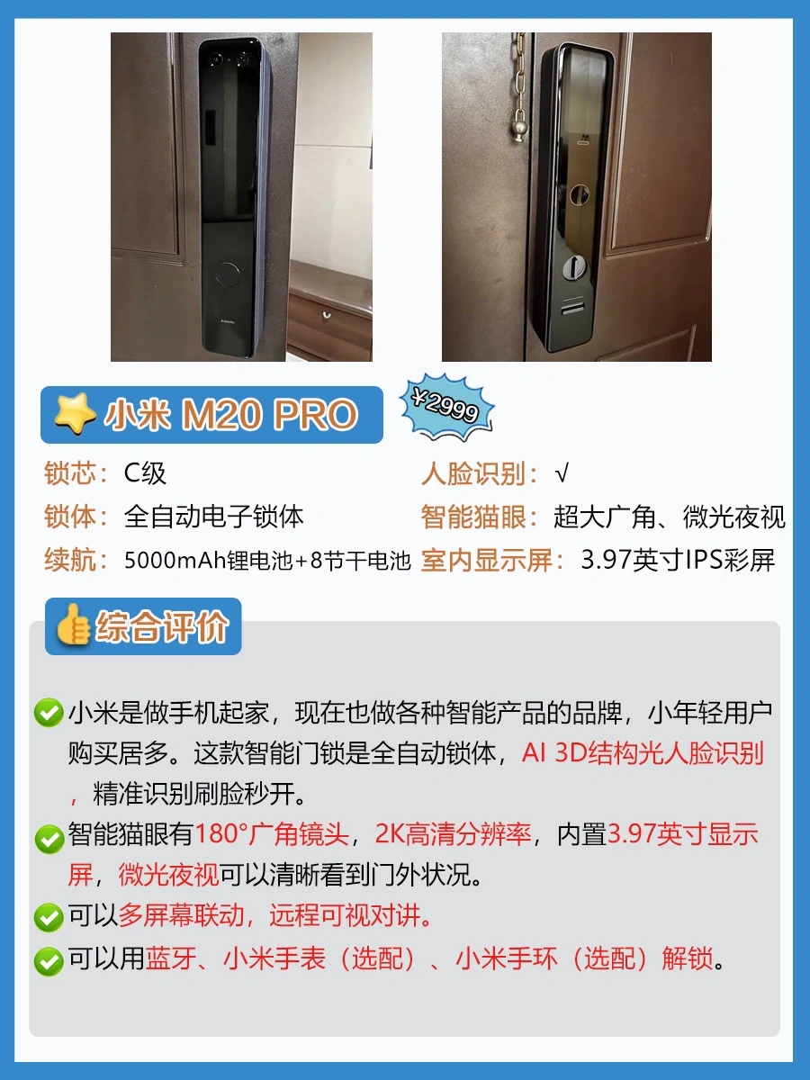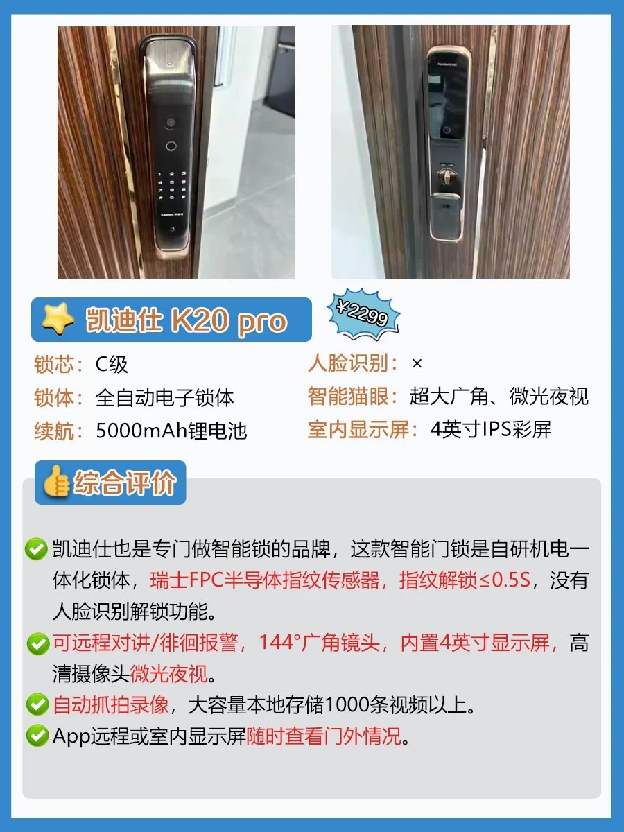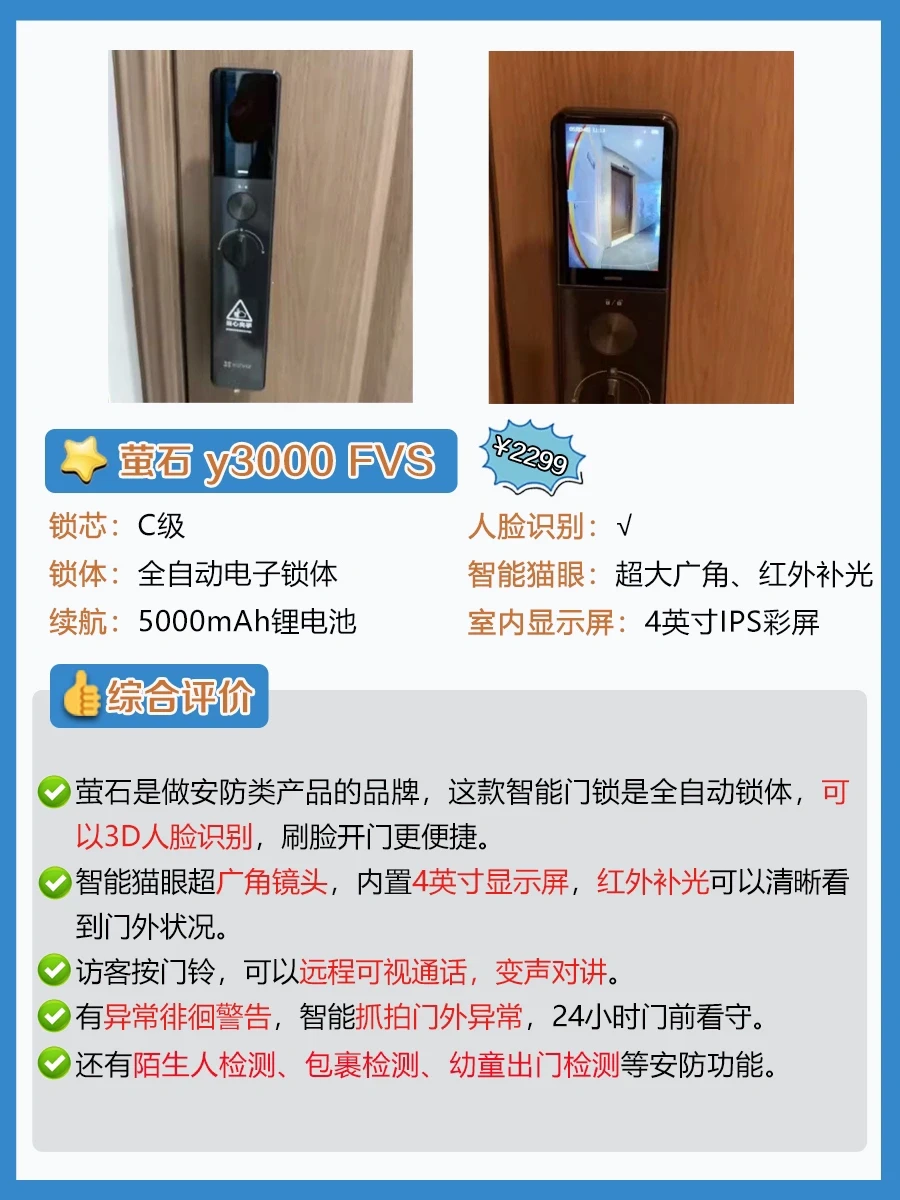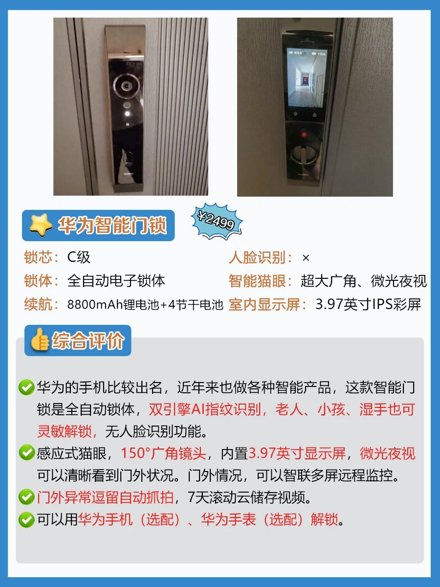 ✨想要有wifi远程控制、人脸识别、智能猫眼、可视大屏的高端款,预算要在2-3k。