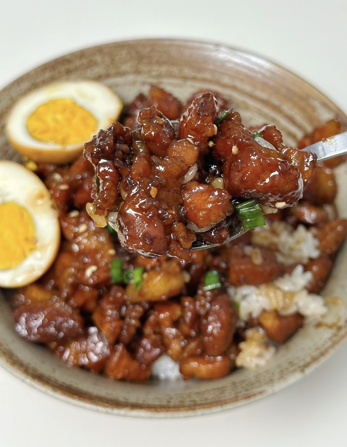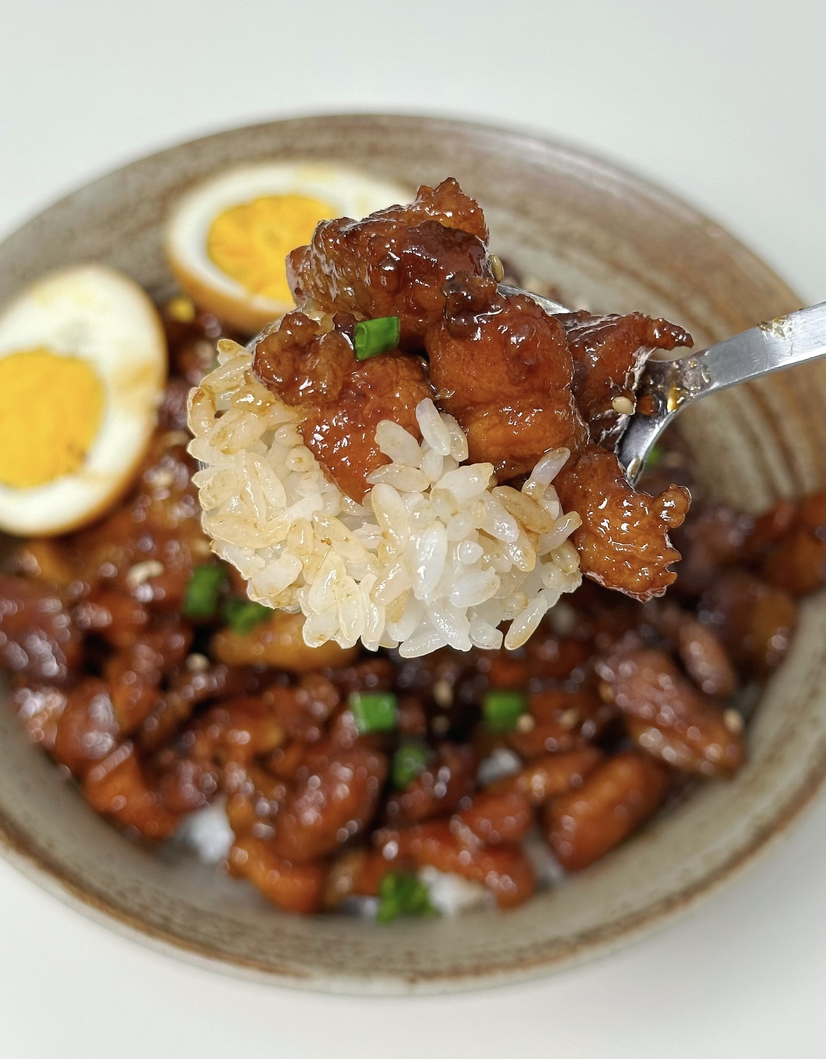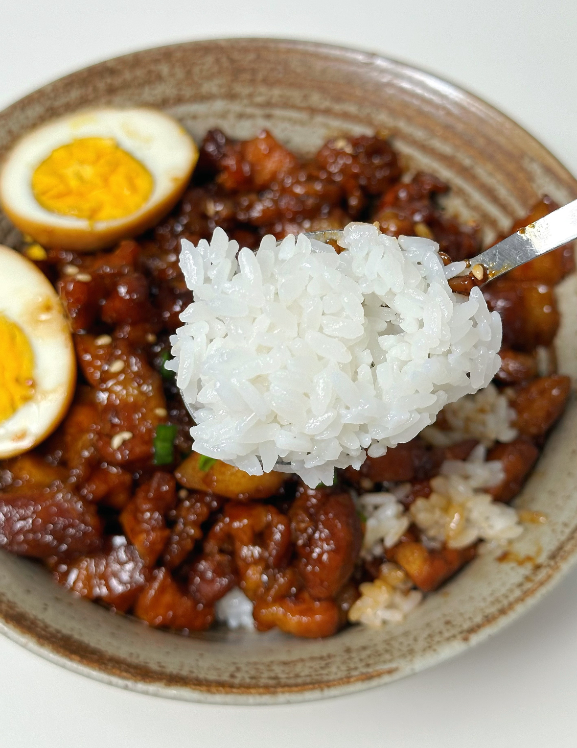 端上桌,先别急着吃,拍张照,滤镜都不用开,酱色自带“食欲暴击”。把卤肉连汁浇在热米饭上,鸡蛋对半,蛋黄缓缓流出,像熔岩一样钻进米粒。第一口建议先吃白饭配酱汁,咸甜平衡,带一点可乐的微妙气泡感;第二口咬下五花,脂肪已经融化成胶,瘦肉吸饱汤汁,入口轻轻一抿就散开;第三口把半个卤蛋压碎,让蛋黄和肉酱纠缠在一起,你会听见脑子里“叮”的一声:外卖是什么?真不熟。