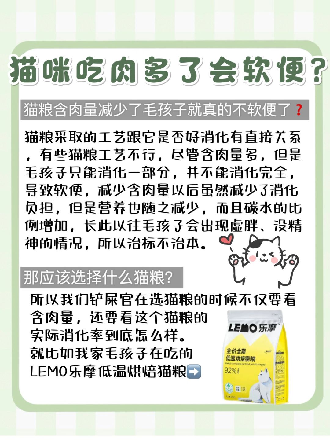 ✅猫粮采取的工艺跟它是否好消化有直接关系,有些猫粮工艺不行,尽管含肉量多,但是毛孩子只能消化一部分,并不能消化完全,导致软便,减少含肉量以后虽然减少了消化负担,但是营养也随之减少,而且碳水的比例增加,长此以往毛孩子会出现虚胖、没精神的情况,所以治标不治本。
