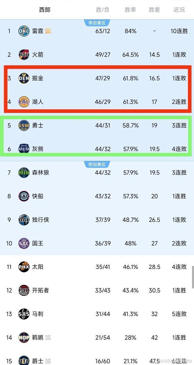 来瞧瞧NBA西部球队的最新排名情况!掘金意外输球,这可让湖人白捡了个大便宜,两队胜场差距仅0.5场。另外,勇士成功逆袭灰熊,跃居第五;森林狼也给力,把快船给压制住了。