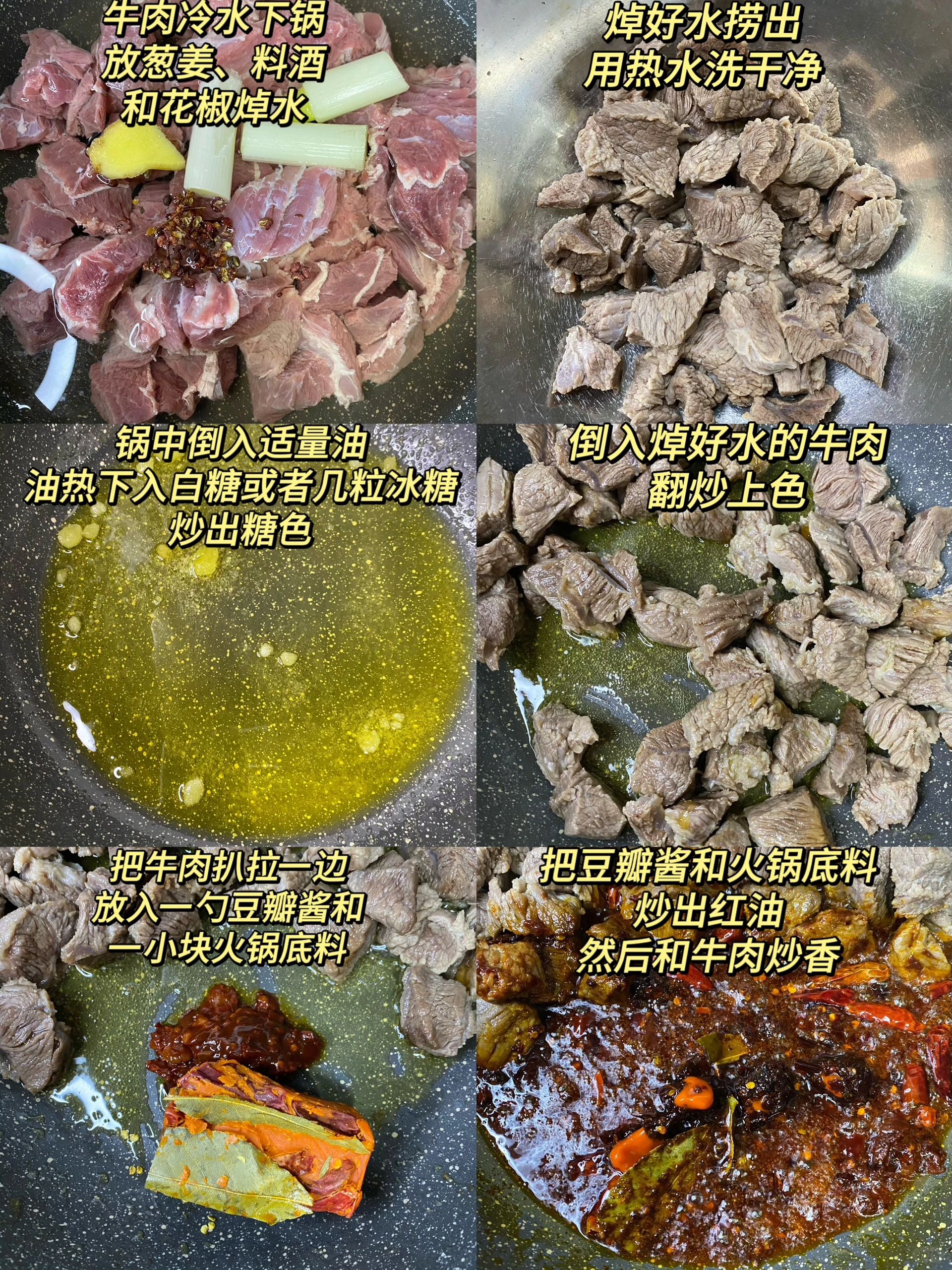 3、锅中倒入适量油,油热下入少许白糖或者冰糖炒出糖色,倒入焯好水的牛肉翻炒上色,把牛肉扒拉一边,放入一勺豆瓣酱和一小块火锅底料炒出红油,然后和牛肉混合炒香。