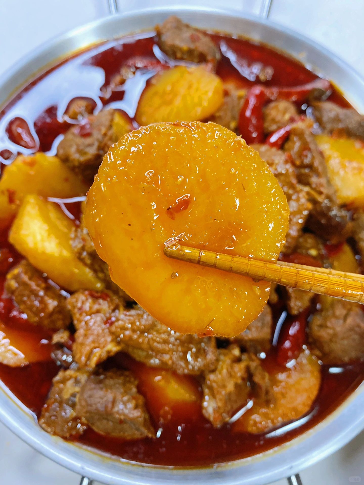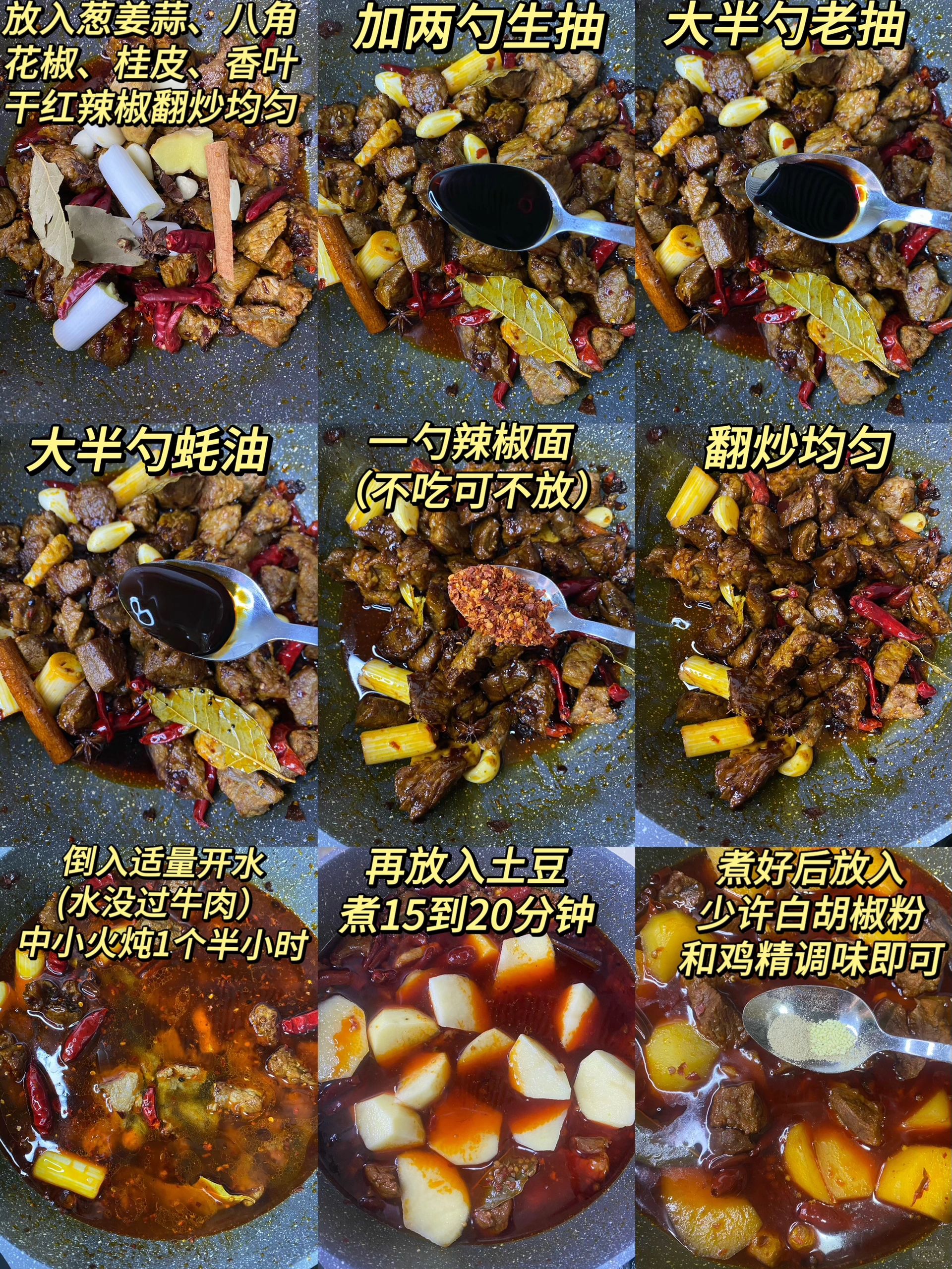 5、倒入适量开水中小火炖1个半小时(水要没过牛肉),再放入土豆煮15到20分钟。煮好后放入少许白胡椒粉和鸡精调味即可。