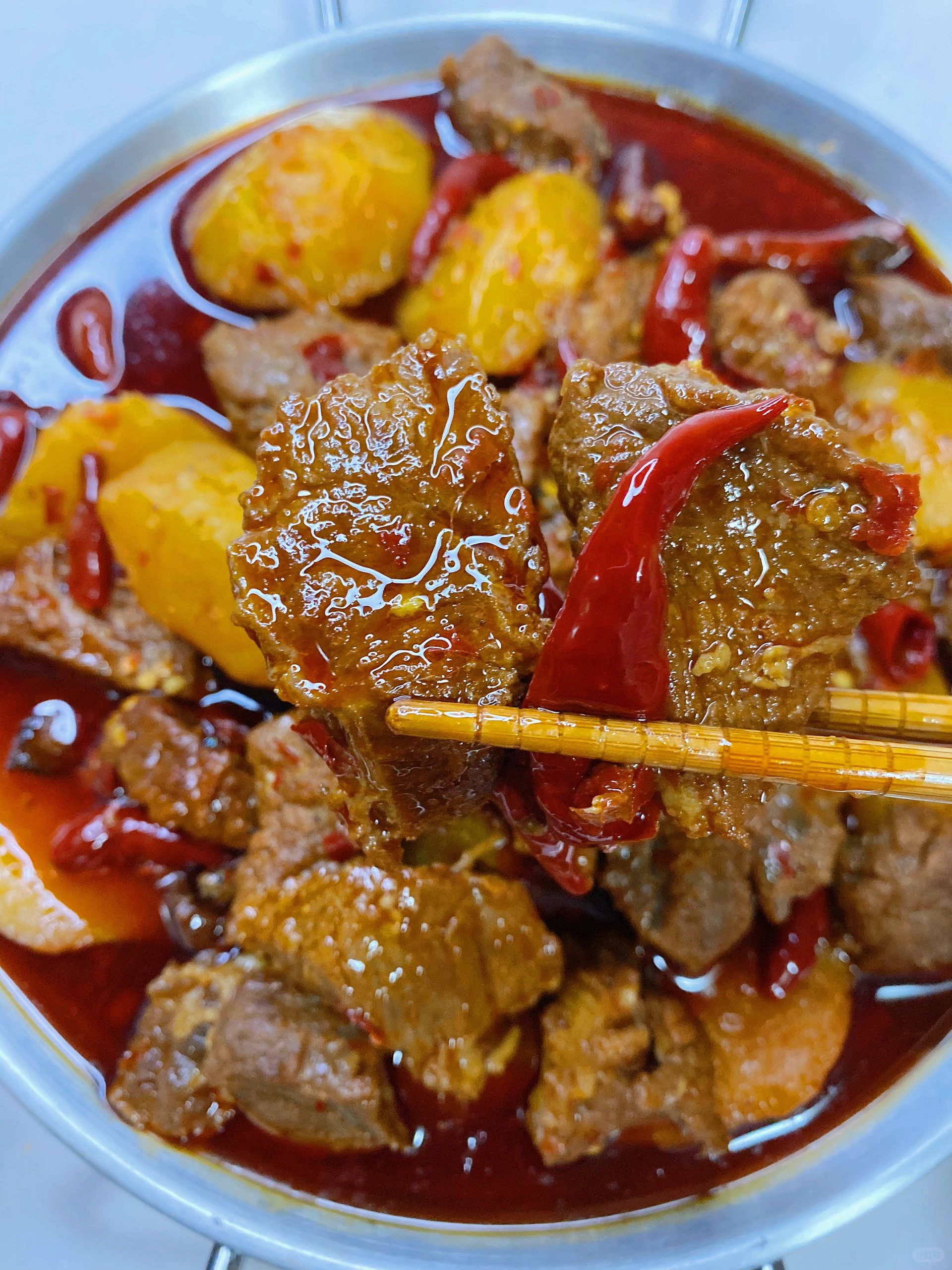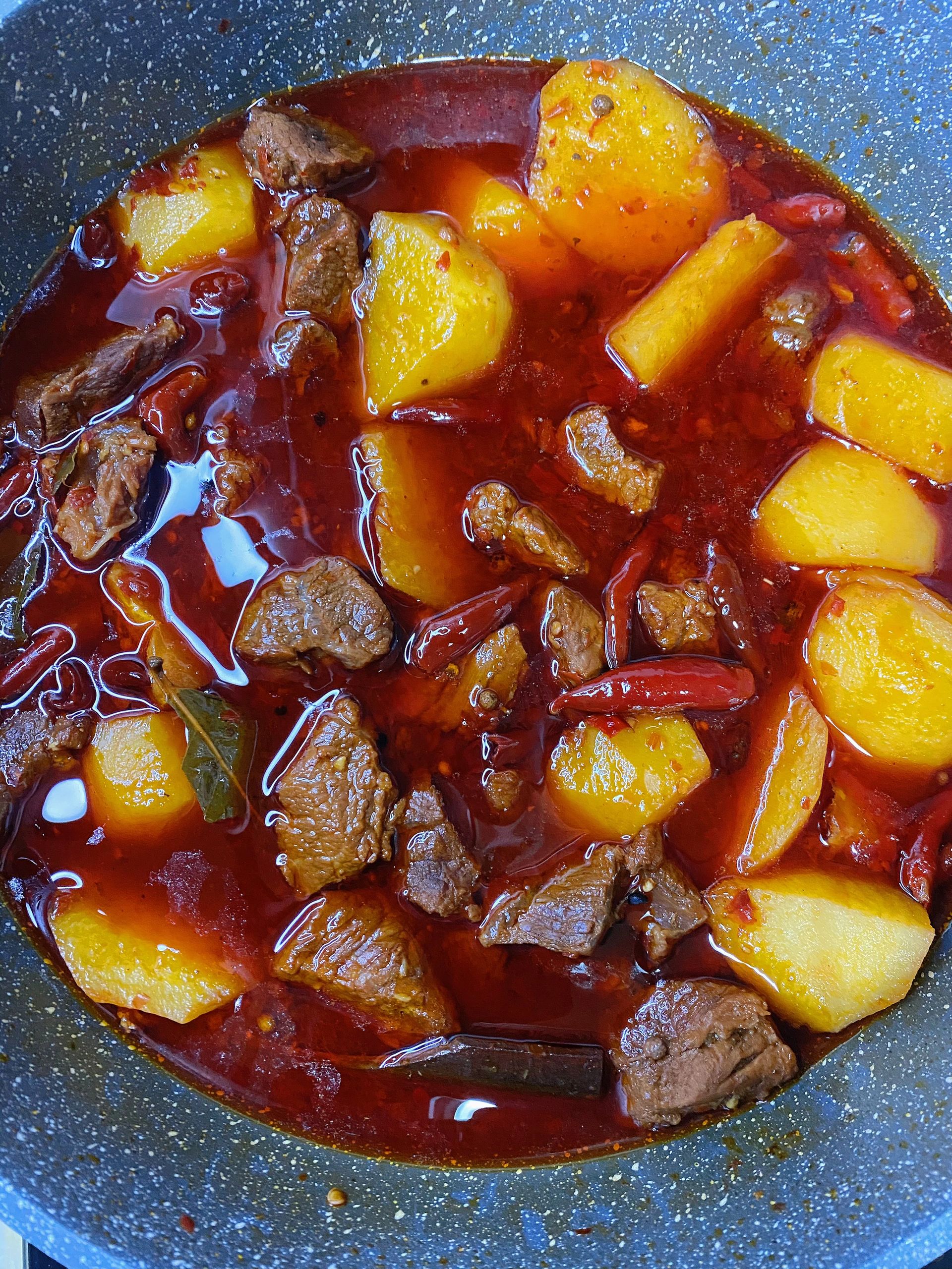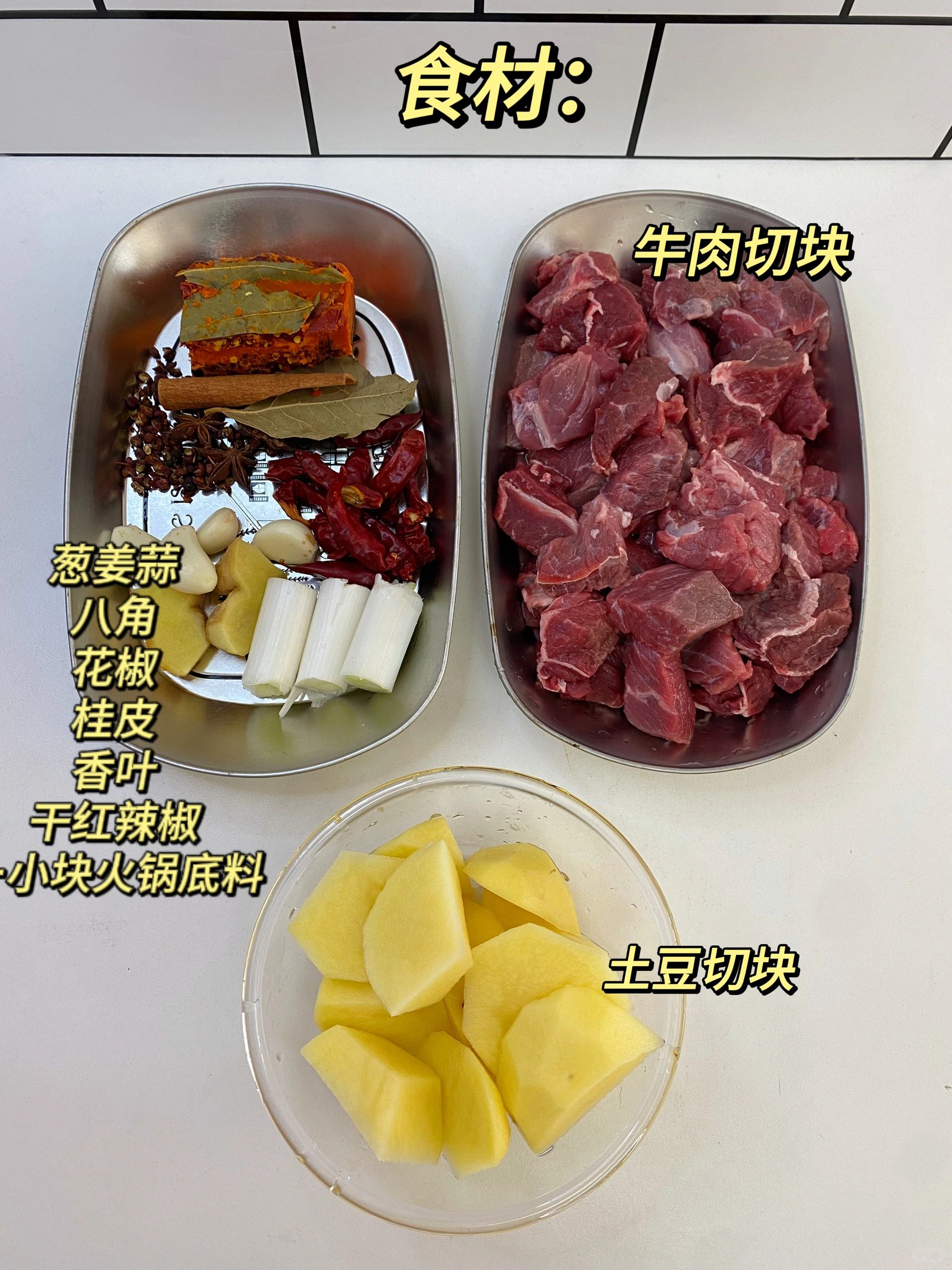 牛肉、土豆、葱姜蒜、干红辣椒、花椒、八角、桂皮、香叶