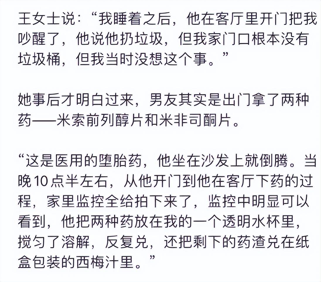 男医生把女朋友毒流产,下药全过程曝光,堪称今年最有毒的新闻! 北京王女士怀孕后,男友不愿意结婚也不想要孩子,并在5月17日和5月20日两次给王女士投下堕胎药,致其流产。但王女士因为感情和年龄的焦虑,没有报警处理。男友和母亲登场,劝王女士原谅他,并表示可以考虑结婚,王女士最终选择原谅。但此事引起网友的愤怒,认为男友不配为医生。