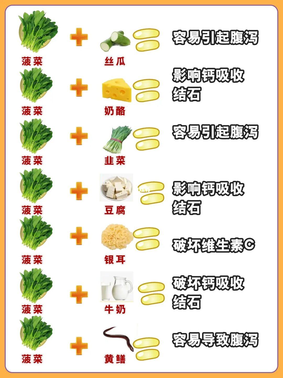 菠菜+豆腐:形成草酸钙,钙无法吸收