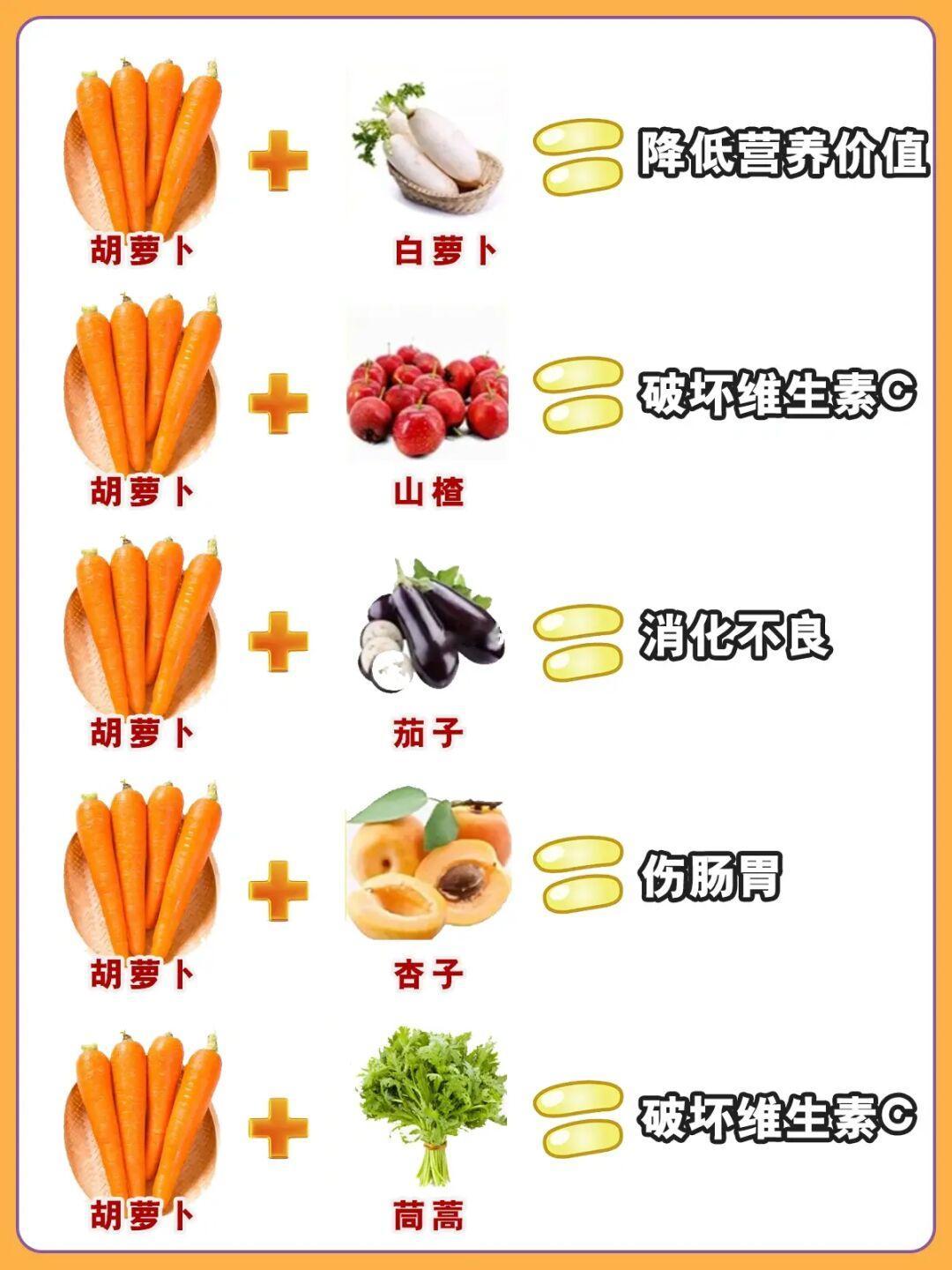胡萝卜+白萝卜:胡萝卜含有抗坏血酸酶,会破坏白萝卜中的维生素c,使两种萝卜的营养价值都大为降低