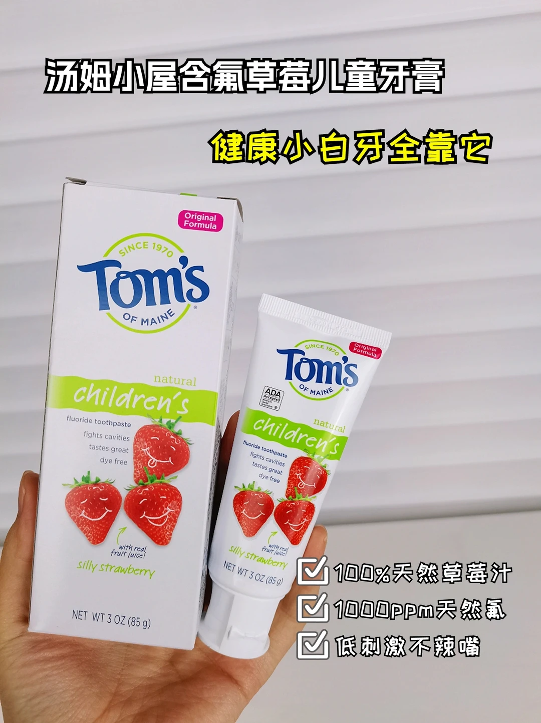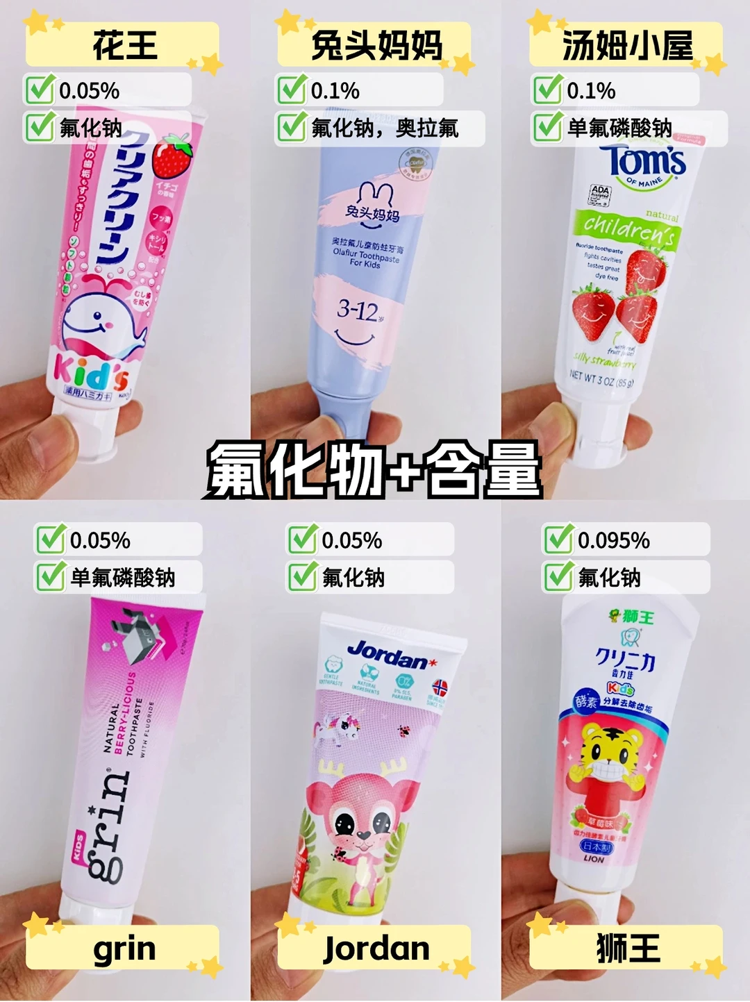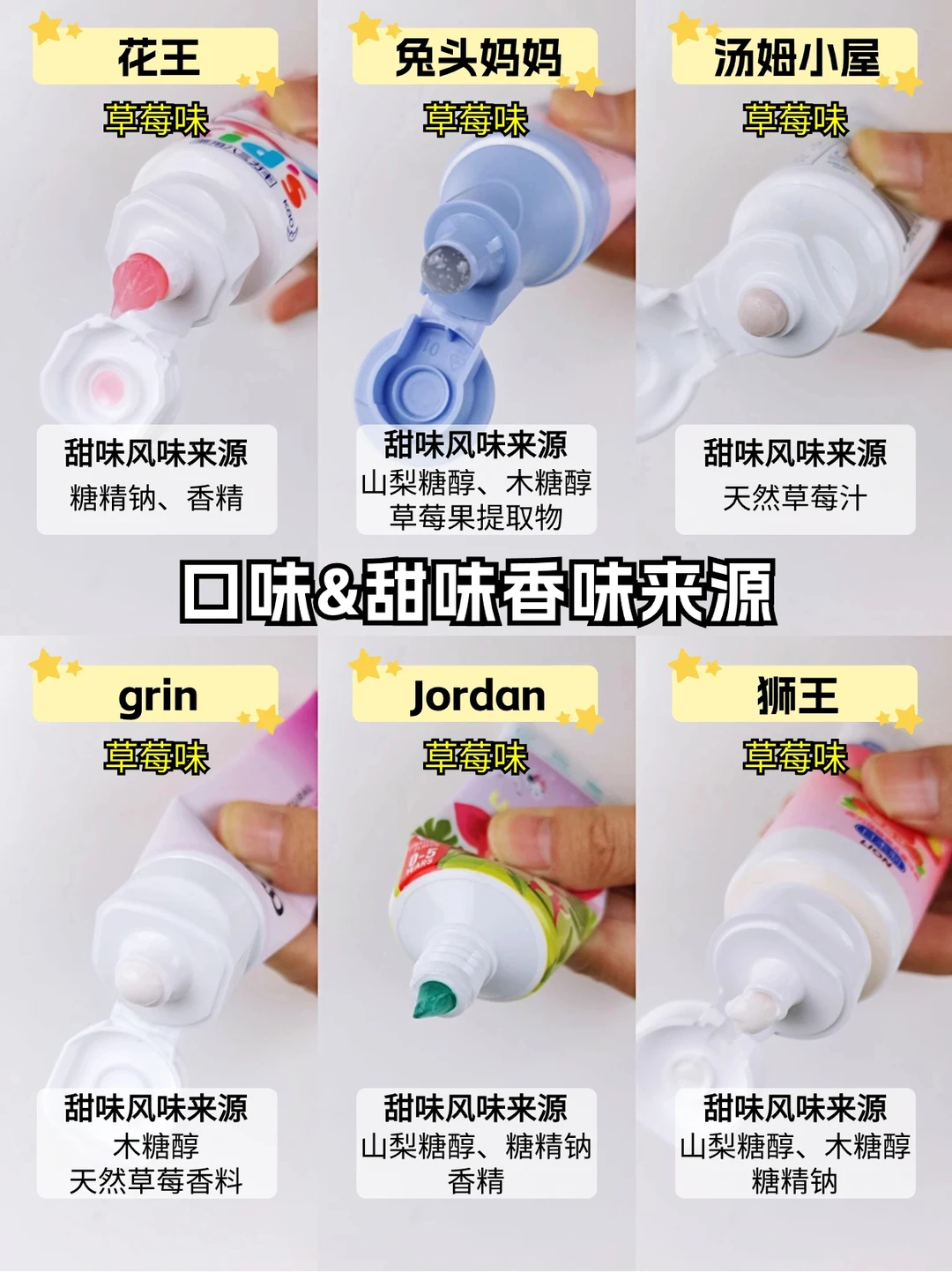 刚长出乳牙的宝宝就要开始用牙膏刷牙了 市面上的牙膏琳琅满目,到底要怎么选? 今天跟大家分享挑选宝宝牙膏的注意事项,也整理了比较热门的6款宝宝牙膏的对比分析 希望小朋友们可以用对牙膏,刷出一口大白牙 . 选宝宝牙膏看什么? ✅看功效 🔸含氟量:氟可以在快速在牙齿表面形成保护层,预防龋齿 我国儿童牙膏的氟含量标准:0.05%-0.11% ,含氟量应该在这个范围内 常见成分:氟化钠、奥拉氟、单氟磷酸钠都是常见有效的氟化物 🔸权威机构认证:国内外权威机构的临床证明 ✅看口味 使用甜味剂可以显著提高宝宝的易接受程度,选择天然来源的甜味剂或含水果汁的为佳,要注意避开糖精钠等人工甜味剂 ✅看成分 避免防腐剂(如羟苯丙酯,羟苯丁酯,尼泊金酯类等),人工色素、人工增白剂、酒精等。天然成分更佳,因为配方更加温和安全,避免刺激口腔。 挑选了市面上6款热门儿童牙膏,从含氟量、口味、配料等进行了数据对比,具体信息详见图。大家根据需要进行选择即可。也可以直接跟我抄作业! 我家宝宝目前用的就是汤姆小屋含氟草莓儿童牙膏,天然牙膏品牌,有美国牙科学会ADA和华西口腔医学院的防蛀认证背书,里面含有真正草莓汁,味道清新不辣嘴,低泡温和~小满刷牙完全不抗拒 希望这篇笔记可以帮到各位正在选牙膏的妈妈们~ 也希望每个宝宝都有一口好牙~