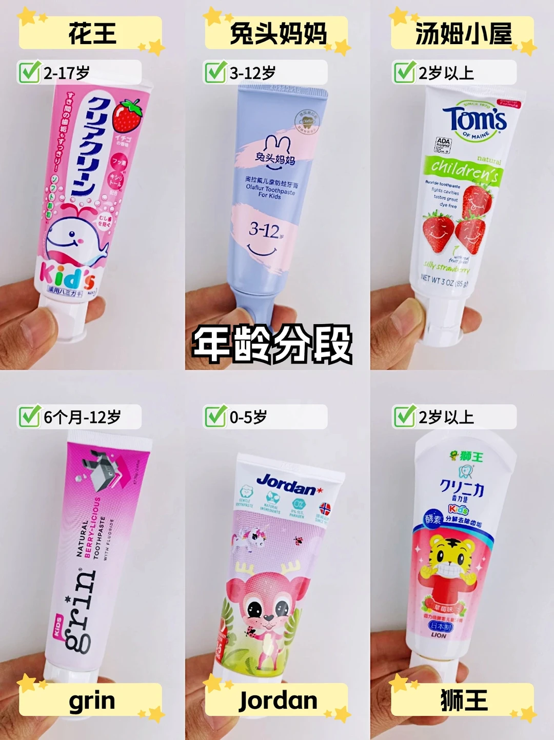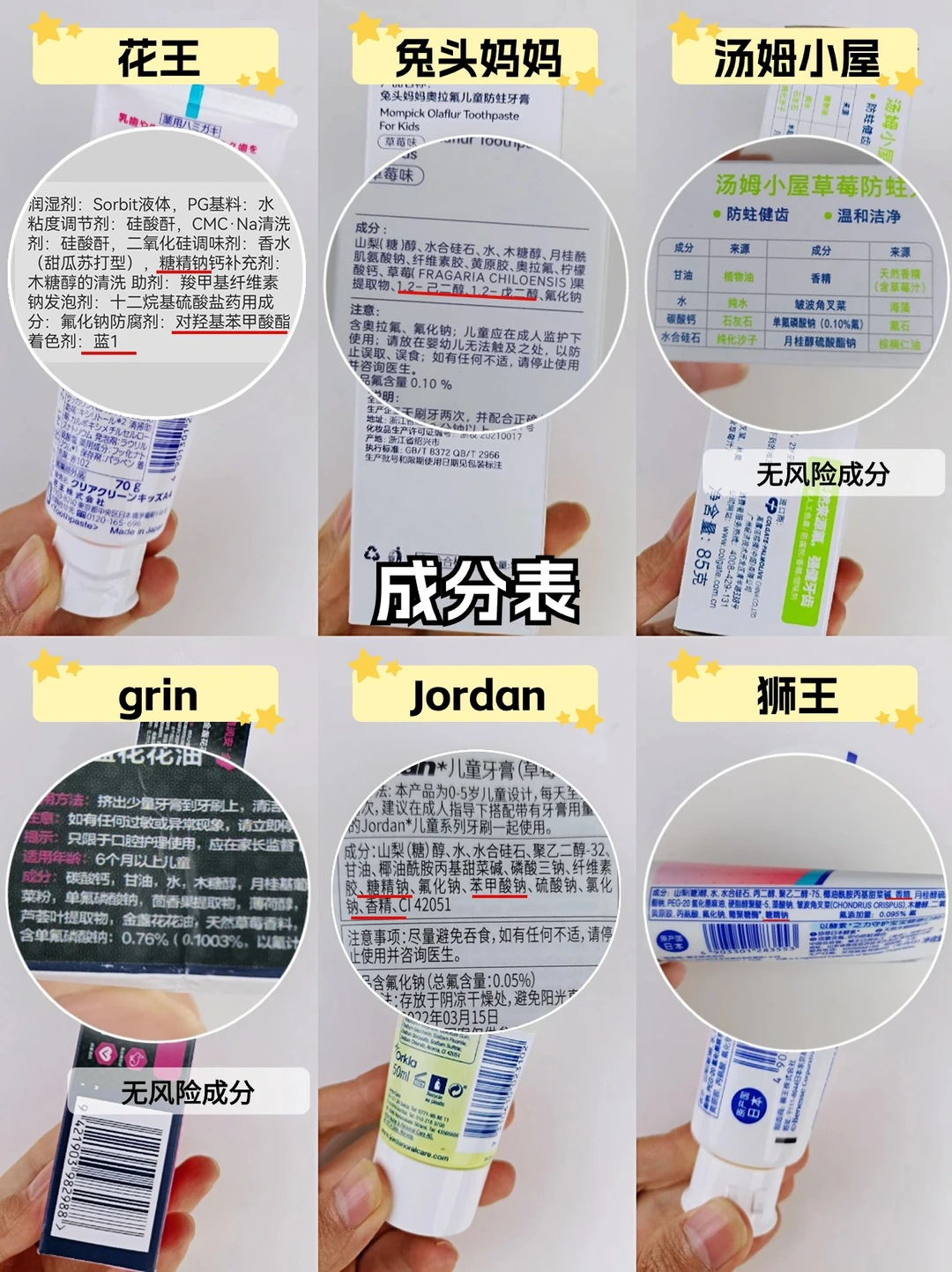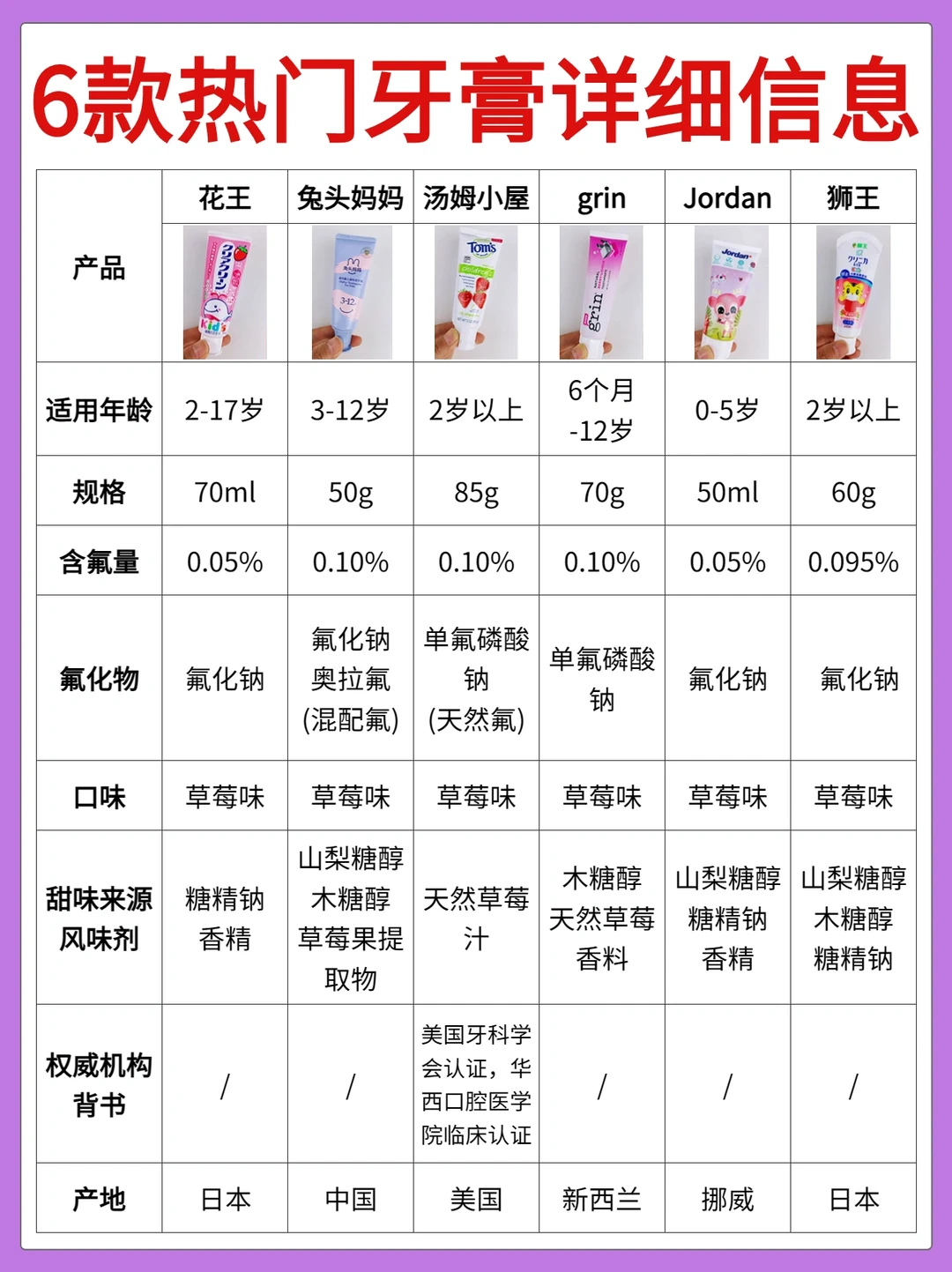 刚长出乳牙的宝宝就要开始用牙膏刷牙了 市面上的牙膏琳琅满目,到底要怎么选? 今天跟大家分享挑选宝宝牙膏的注意事项,也整理了比较热门的6款宝宝牙膏的对比分析 希望小朋友们可以用对牙膏,刷出一口大白牙 . 选宝宝牙膏看什么? ✅看功效 🔸含氟量:氟可以在快速在牙齿表面形成保护层,预防龋齿 我国儿童牙膏的氟含量标准:0.05%-0.11% ,含氟量应该在这个范围内 常见成分:氟化钠、奥拉氟、单氟磷酸钠都是常见有效的氟化物 🔸权威机构认证:国内外权威机构的临床证明 ✅看口味 使用甜味剂可以显著提高宝宝的易接受程度,选择天然来源的甜味剂或含水果汁的为佳,要注意避开糖精钠等人工甜味剂 ✅看成分 避免防腐剂(如羟苯丙酯,羟苯丁酯,尼泊金酯类等),人工色素、人工增白剂、酒精等。天然成分更佳,因为配方更加温和安全,避免刺激口腔。 挑选了市面上6款热门儿童牙膏,从含氟量、口味、配料等进行了数据对比,具体信息详见图。大家根据需要进行选择即可。也可以直接跟我抄作业! 我家宝宝目前用的就是汤姆小屋含氟草莓儿童牙膏,天然牙膏品牌,有美国牙科学会ADA和华西口腔医学院的防蛀认证背书,里面含有真正草莓汁,味道清新不辣嘴,低泡温和~小满刷牙完全不抗拒 希望这篇笔记可以帮到各位正在选牙膏的妈妈们~ 也希望每个宝宝都有一口好牙~