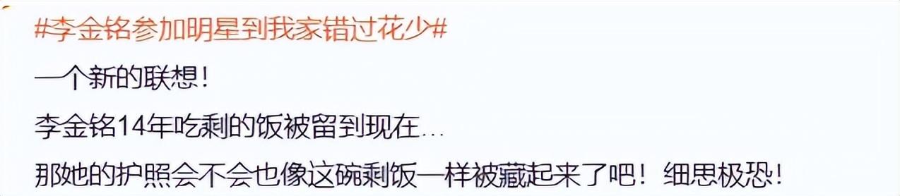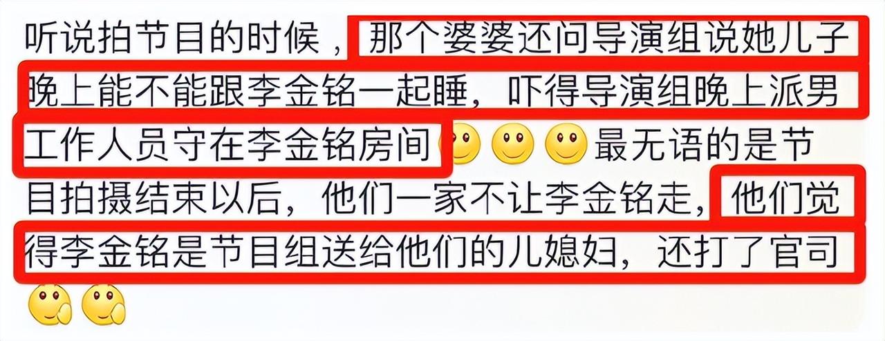 女星拍综艺到农村当“儿媳”,被要求陪睡!现实版《盲山》上演… 在《明星到我家》中,李金铭被安排到一个普通农家,不仅被婆婆刁难,大嫂也与她竞争,李金铭输了就要接受农活家务的惩罚。她在节目中的生活非常艰苦,连吃的饭都是红薯藤和芭蕉根煮出来的,每天还要早起为家人做饭。最后,李金铭和大嫂发生矛盾,节目组决定提前结束她的拍摄,但李金铭主动道歉并给大嫂买礼物,这件事才得以解决。