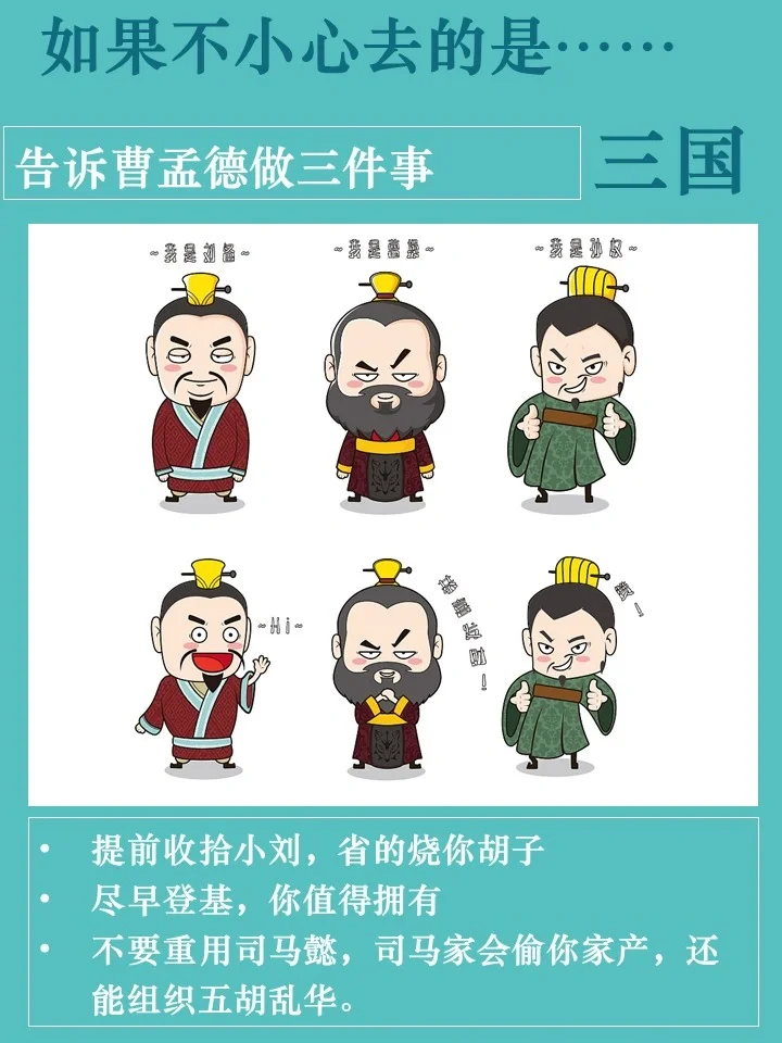 ✅去三国的话,还是喜欢曹孟德,提前把刘备收拾了,尽早登基,搞掉司马懿,省得五胡乱华,闹心;