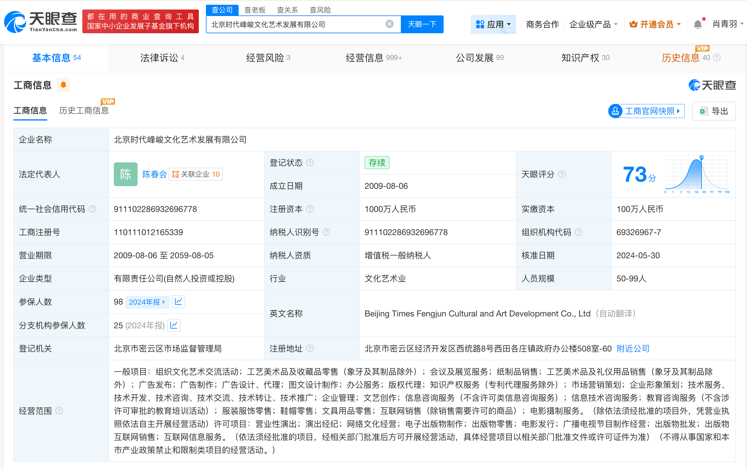 天眼查工商信息显示,北京时代峰峻文化艺术发展有限公司成立于2009年8月,法定代表人为陈春会,注册资本1000万人民币,经营范围含营业性演出、演出经纪、网络文化经营等。股东信息显示,该公司由温素芬、李霏共同持股。
