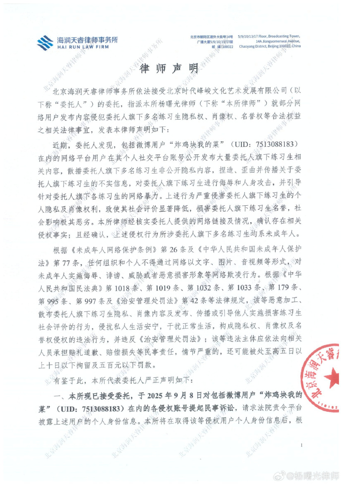 近日,北京时代峰峻文化艺术发展有限公司委托律师发布声明,针对部分网络用户侵犯其旗下练习生隐私权、肖像权及名誉权的行为采取法律行动。声明指出,用户“炸鸡块我的菜”等在社交平台散布旗下多名未成年练习生的非公开信息,传播不实言论,引导网络暴力,严重影响其社会评价。律师事务所已确认侵权事实,并于2025年9月8日提起民事诉讼。此前,公司已多次警告并就类似行为发起系列诉讼,部分案件已立案,用户"东东嘿嘿13824"等在内的部分侵权主体已通过公开发布手写道歉信、赔偿维权损失等方式承担侵权责任。